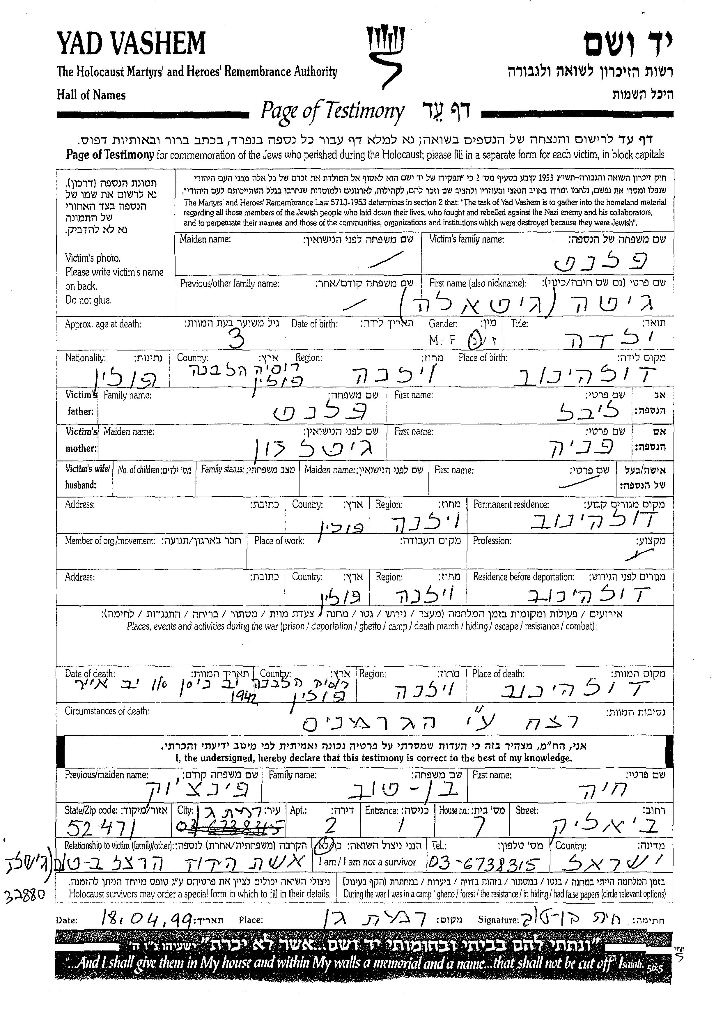 Gita wurde in der Schoah ermordet. Todesort: Dolhinow, Polen im Jahr 1942.
