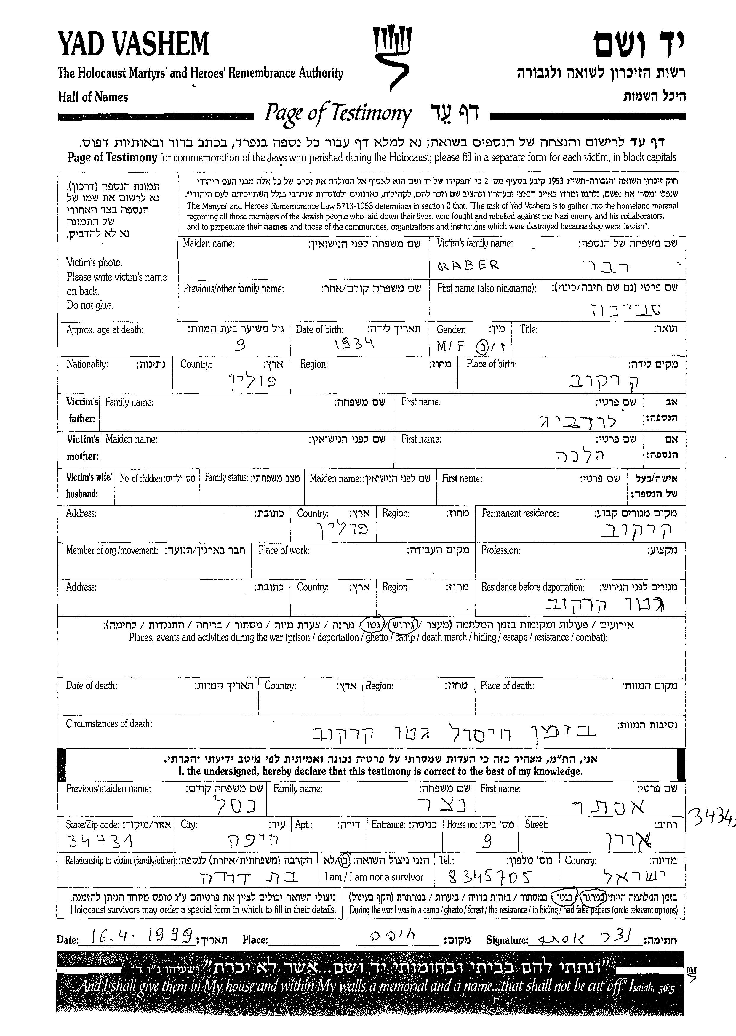 Sabina Raber wurde im Jahr 1934 in Krakow, Polen geboren. Sie war die Tochter von Ludvig und Helena. Vor dem Zweiten Weltkrieg lebte sie in Krakow, Polen. Während des Krieges war sie in Krakow, Polen.