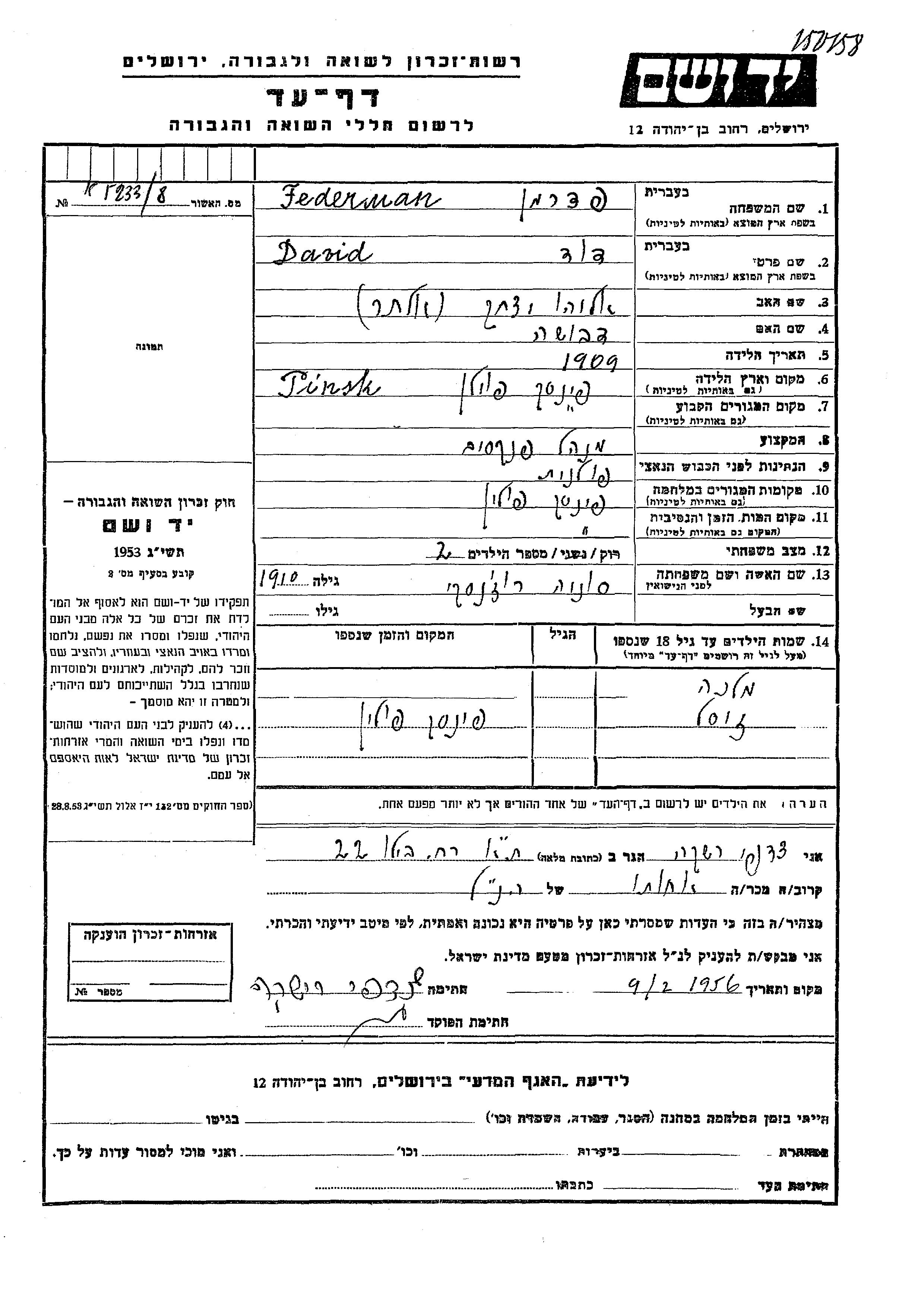 David Federman wurde im Jahr 1907 in Pinsk, Polen geboren. Vor dem Zweiten Weltkrieg lebte er in Pinsk, Polen.