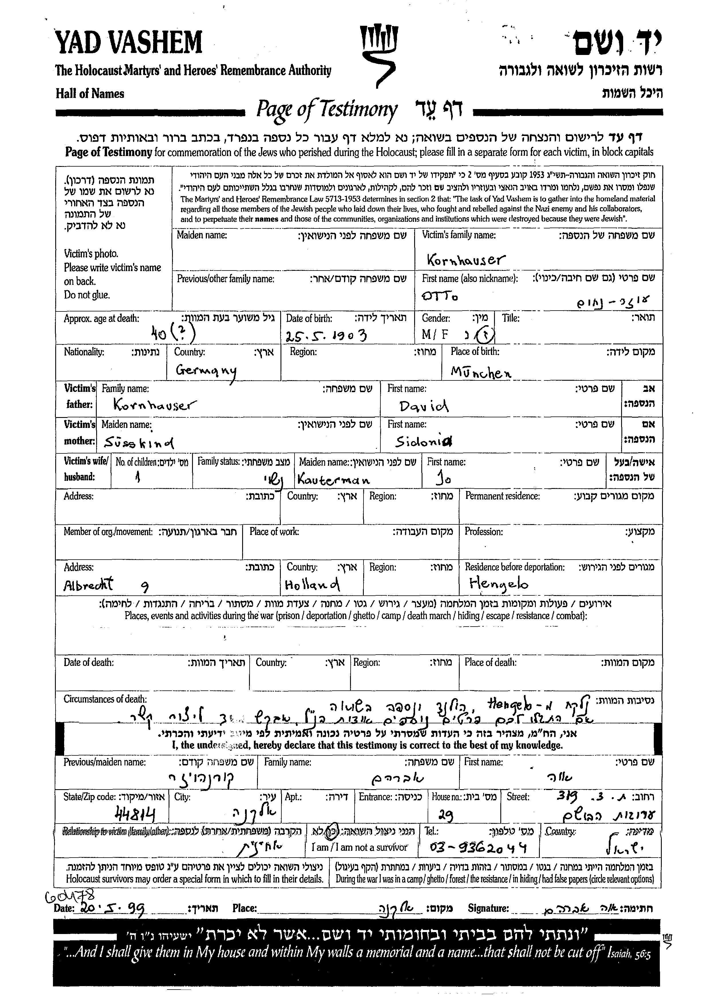 Kornhauser Otto Ozer Nakhum 1903 unbekannter Ort, Gedenkblatt