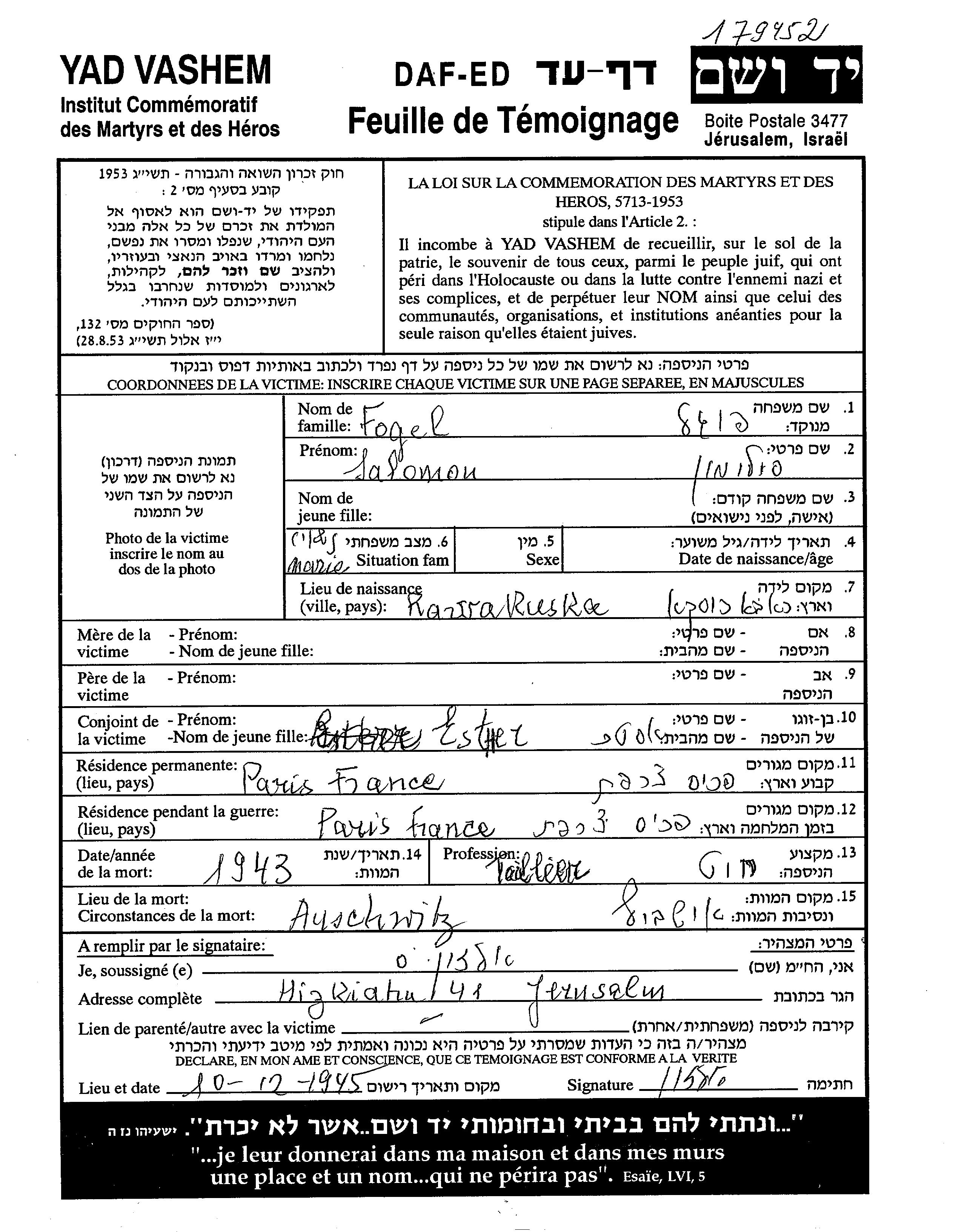 Shlomo Fogel wurde in Rawa Ruska, Polen geboren. Er war Schneider. Vor dem Zweiten Weltkrieg lebte er in Paris, Frankreich.