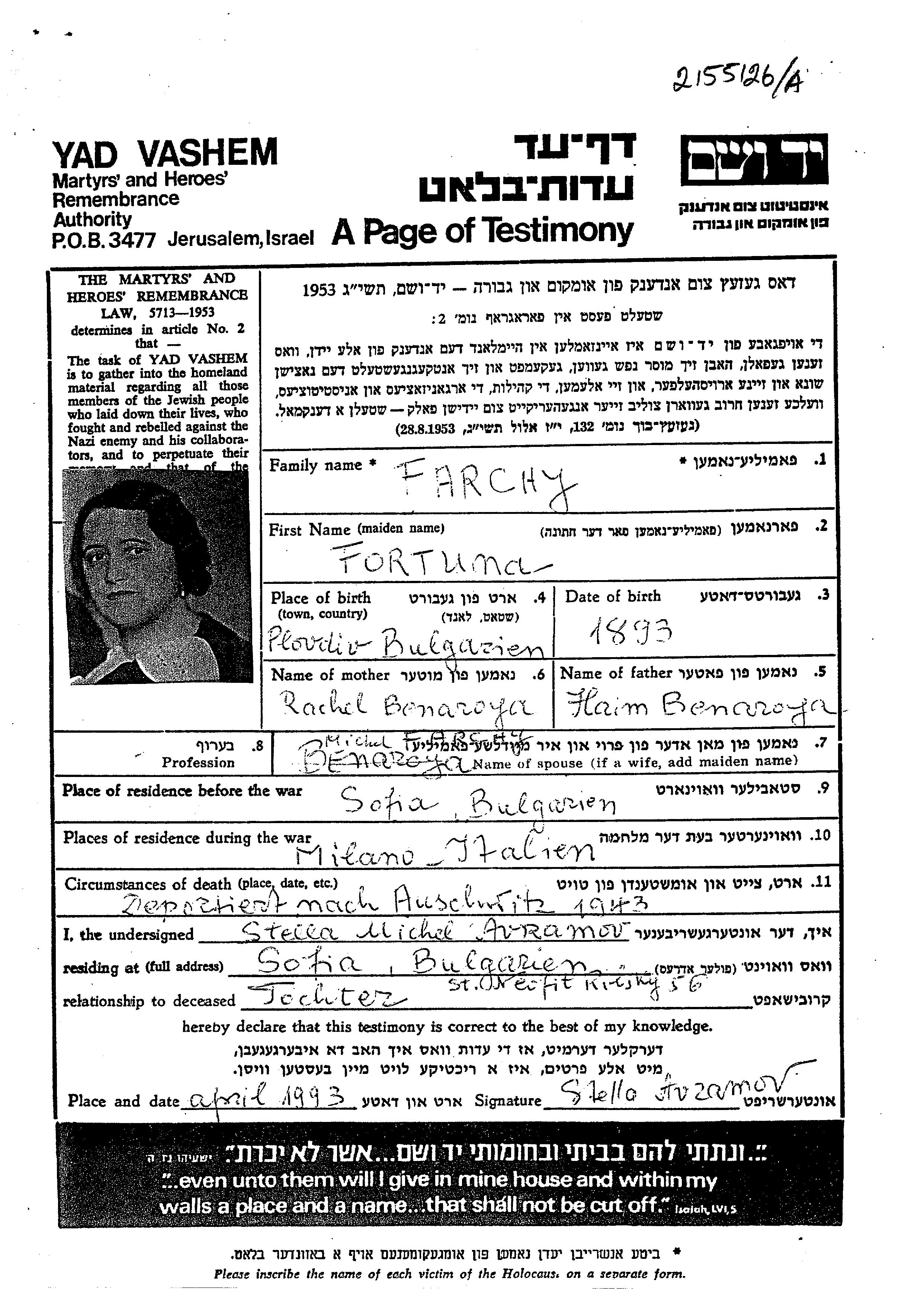 Fortuna Farchy, geb. Benaroya wurde im Jahr 1893 in Plovdiv, Bulgarien geboren. Vor dem Zweiten Weltkrieg lebte sie in Sofia, Bulgarien.