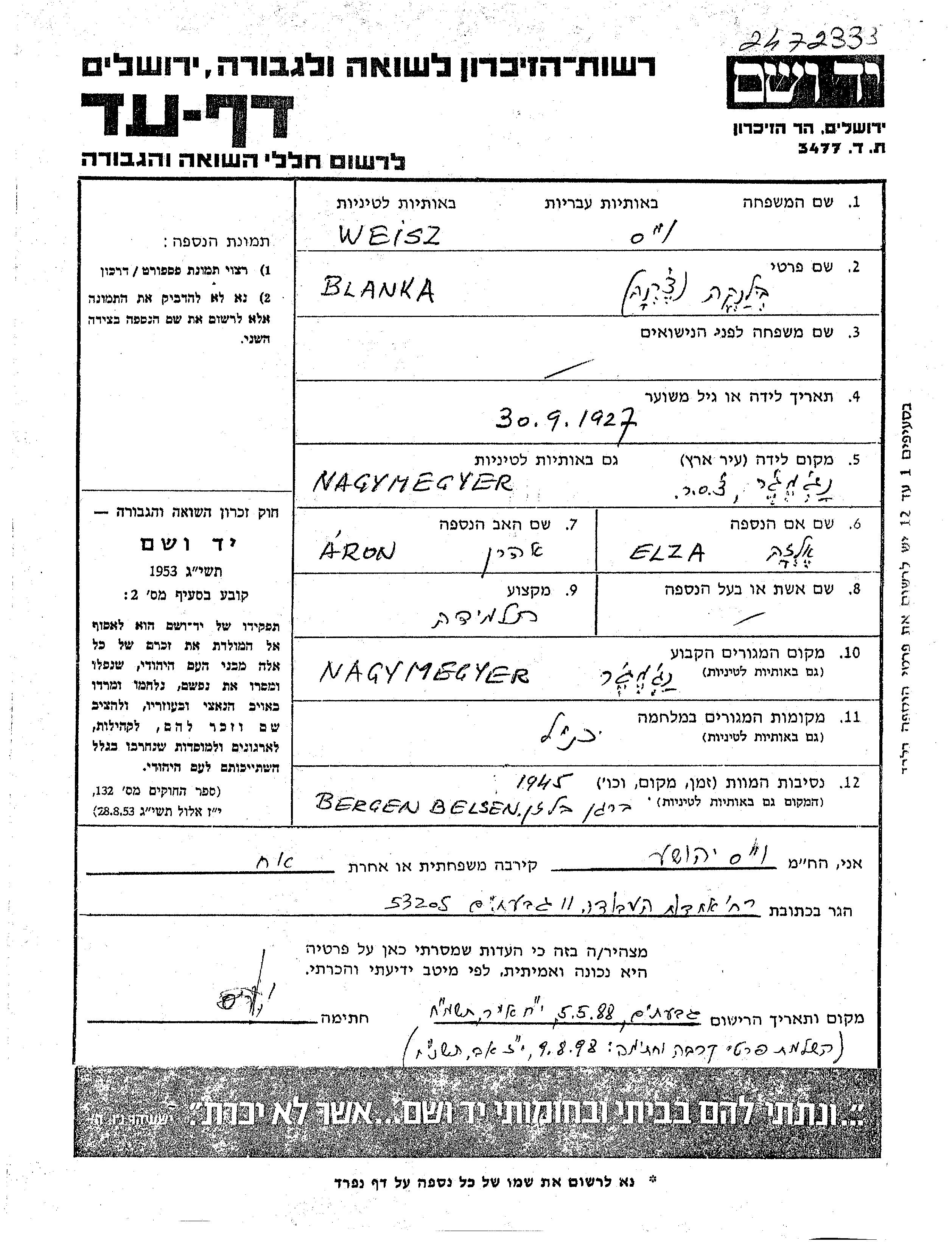 Weisz | Blanka | 1927 | Nagymegyer, Tschechoslowakei | Gedenkblatt |