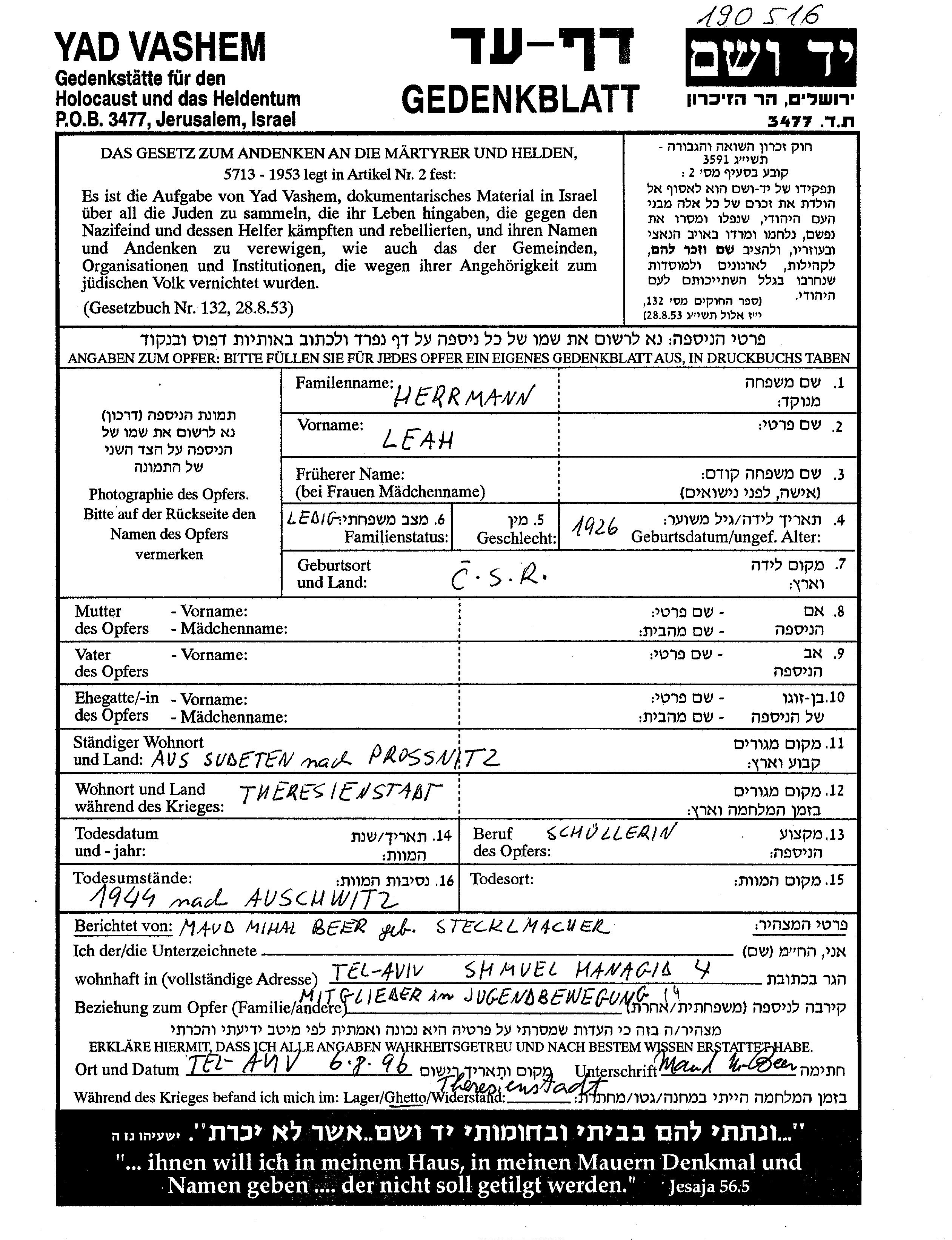 Herrmann Leah 1926 Prossnitz, Tschechoslowakei Gedenkblatt