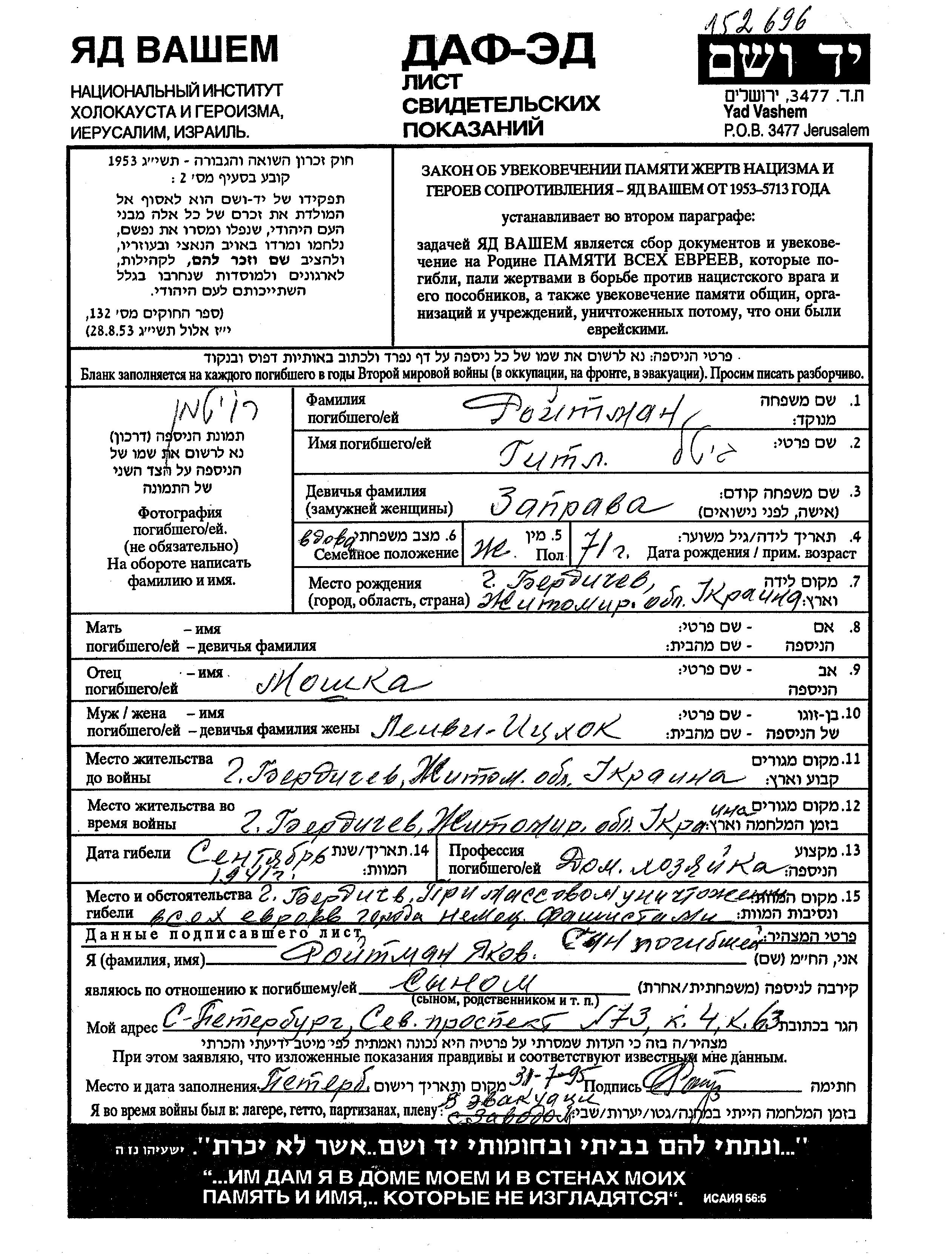 Gitl Roytman, geb. Zaprava wurde im Jahr 1869 in Berdichev, Ukraine (UdSSR) geboren. Sie war Hausfrau. Vor dem Zweiten Weltkrieg lebte sie in Berdichev, Ukraine (UdSSR).