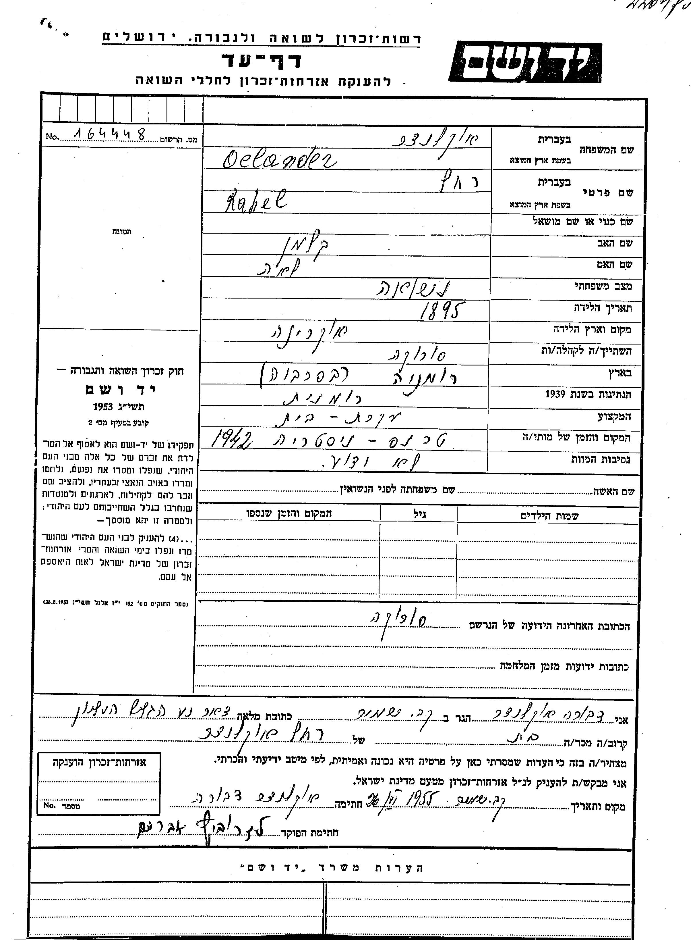 Rakhel Oclander wurde im Jahr 1895 in Ukraine (UdSSR) geboren. Sie war Hausfrau. Vor dem Zweiten Weltkrieg lebte sie in Soroca, Rumänien.