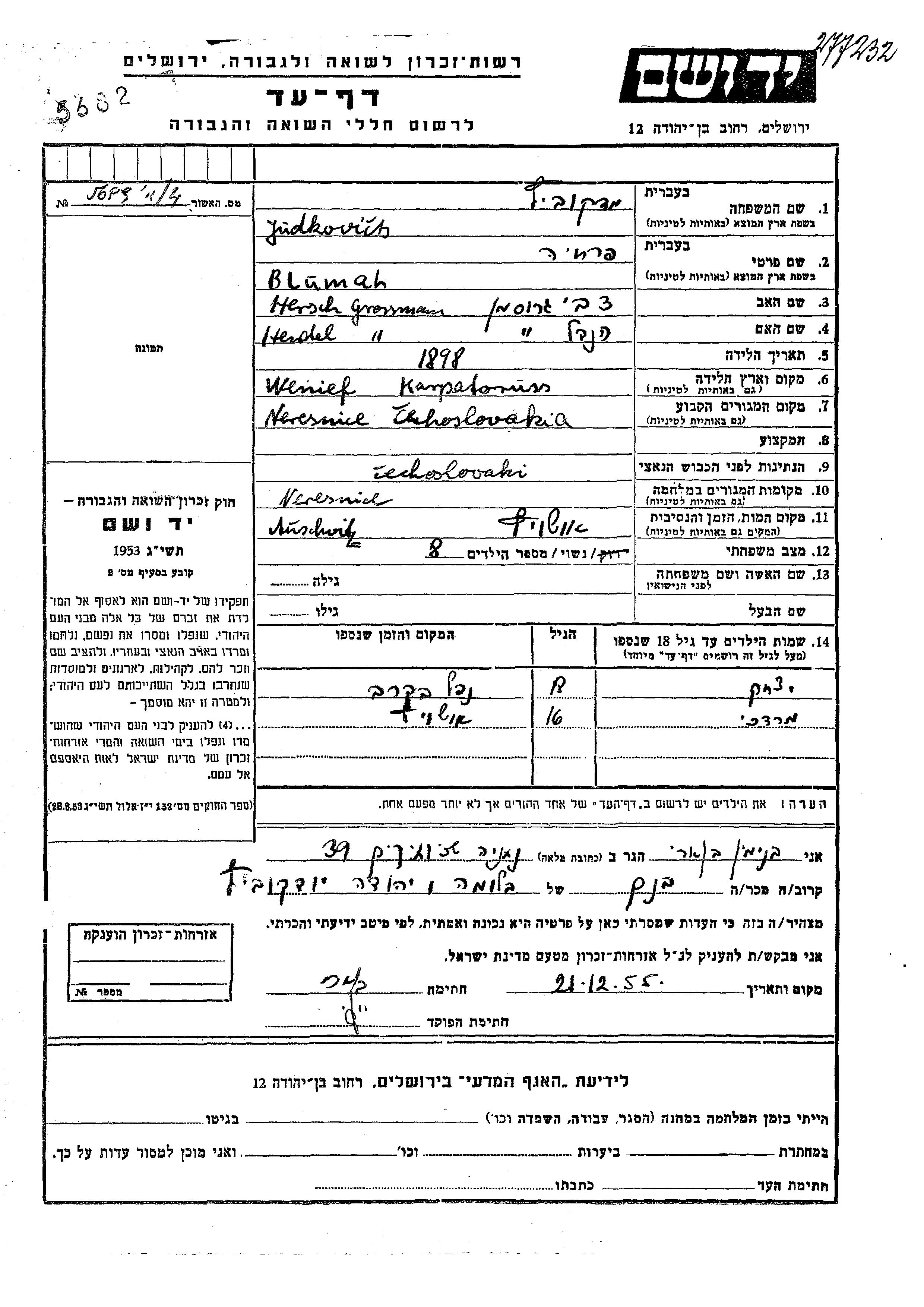 Judkowicz | Bluma | 1893 | Neresnica, Tschechoslowakei | Gedenkblatt |