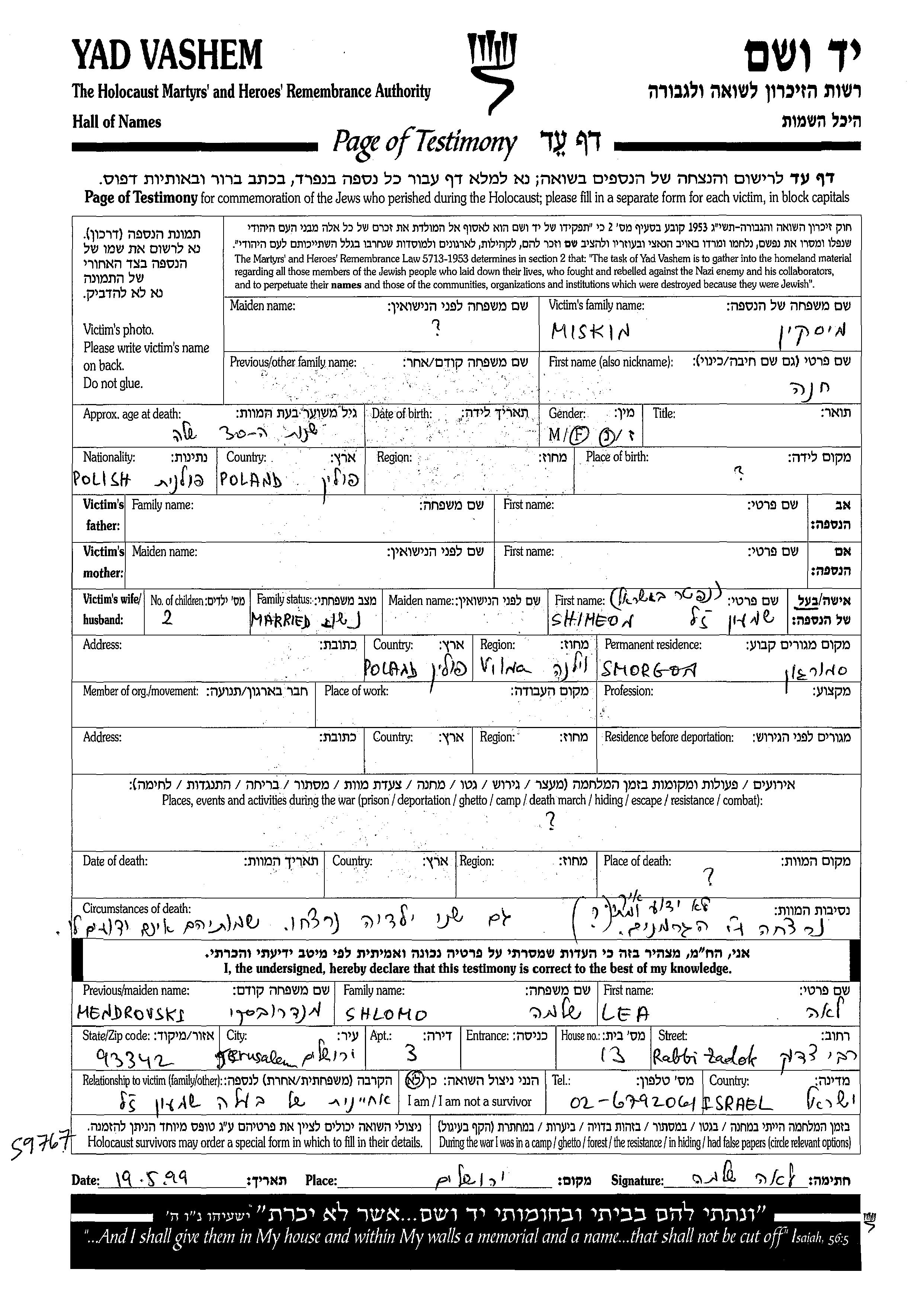 Khana Miskin, geb. Shneidman Shteinman wurde in Polen geboren. Vor dem Zweiten Weltkrieg lebte sie in Smorgon, Polen.