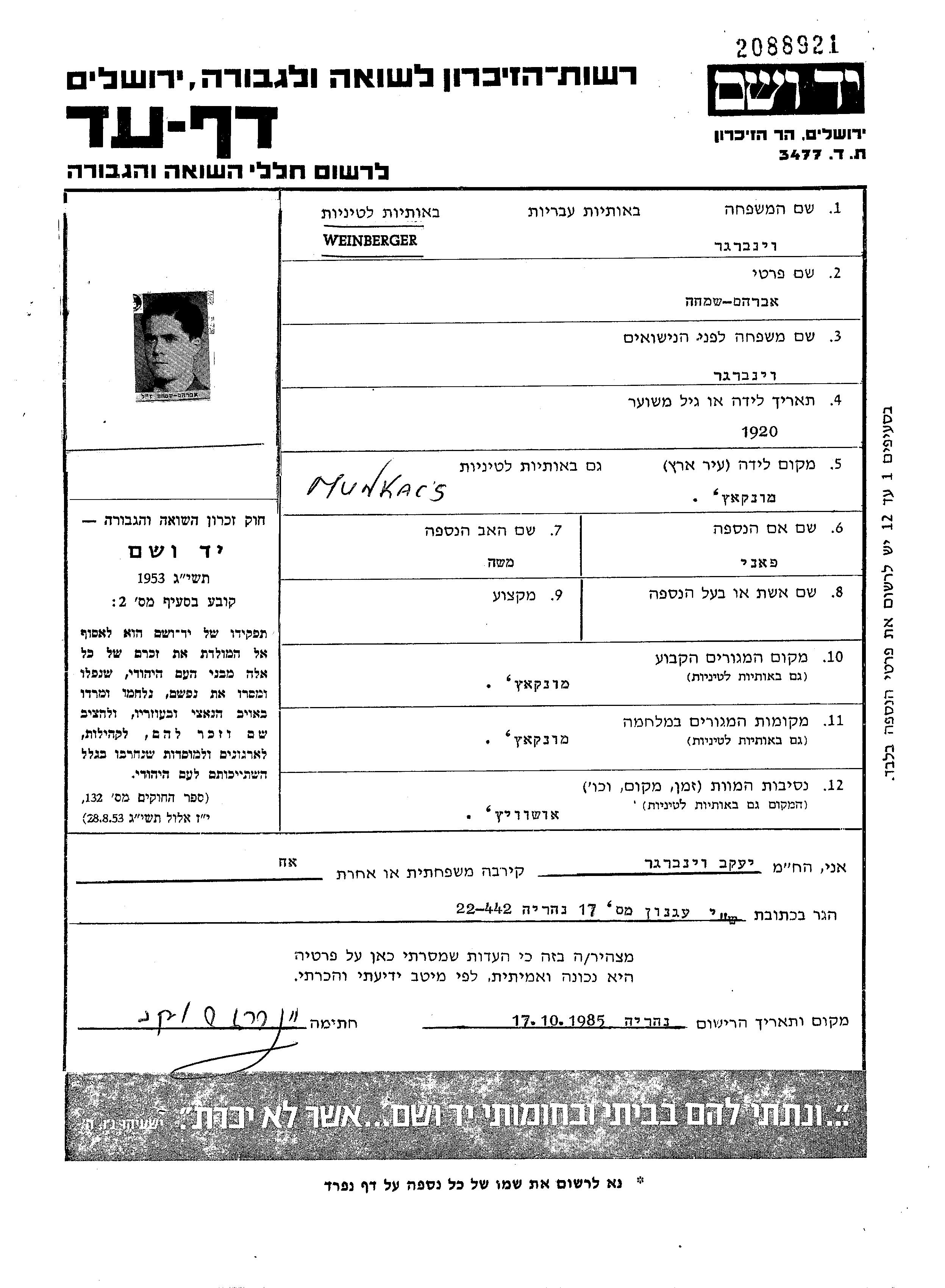 Weinberger Avraham Simkha 1920 Munkacs, Tschechoslowakei Gedenkblatt