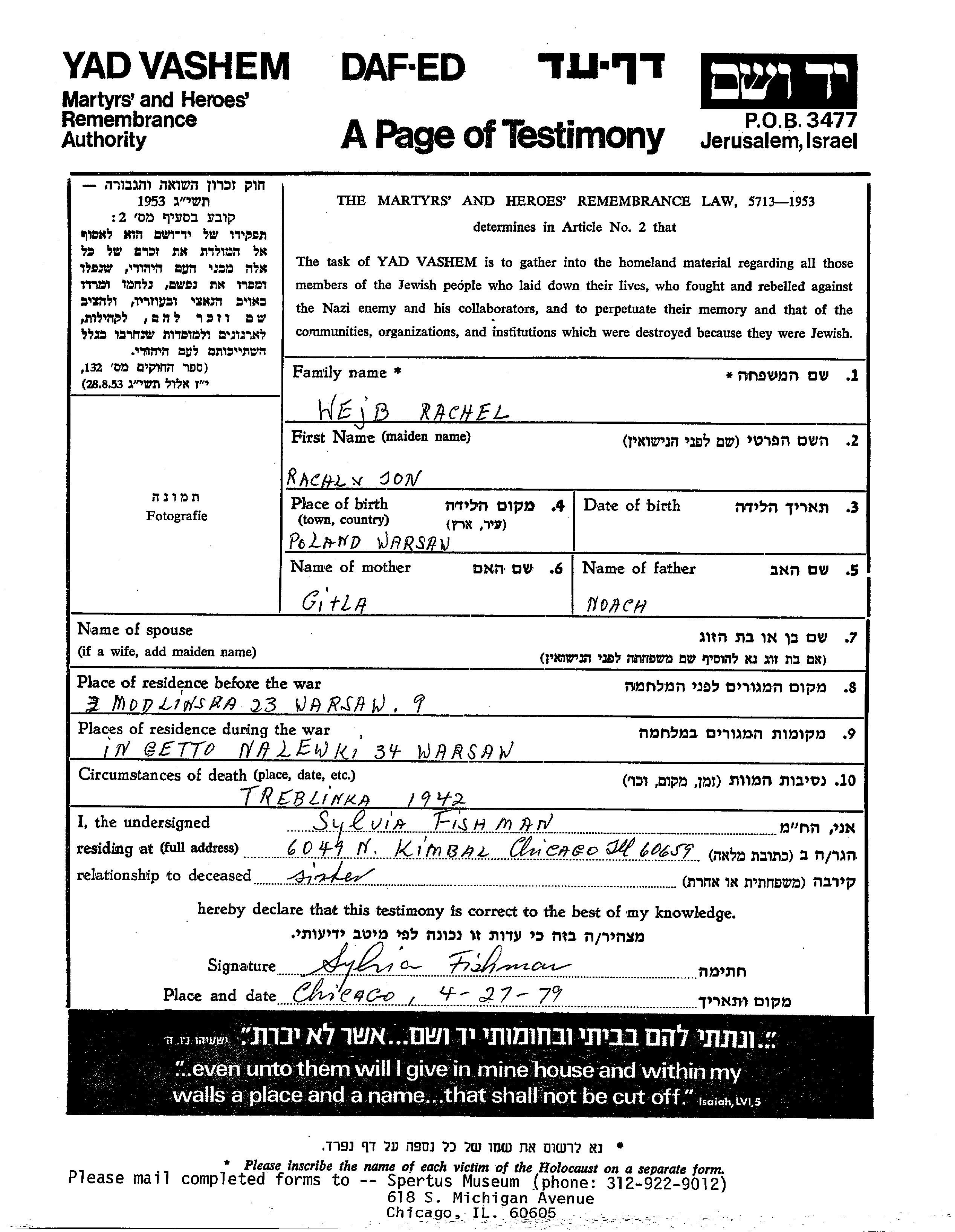 Rakhel Web Wejb, geb. Rachelson wurde in Warszawa, Polen geboren. Vor dem Zweiten Weltkrieg lebte sie in Warszawa, Polen.