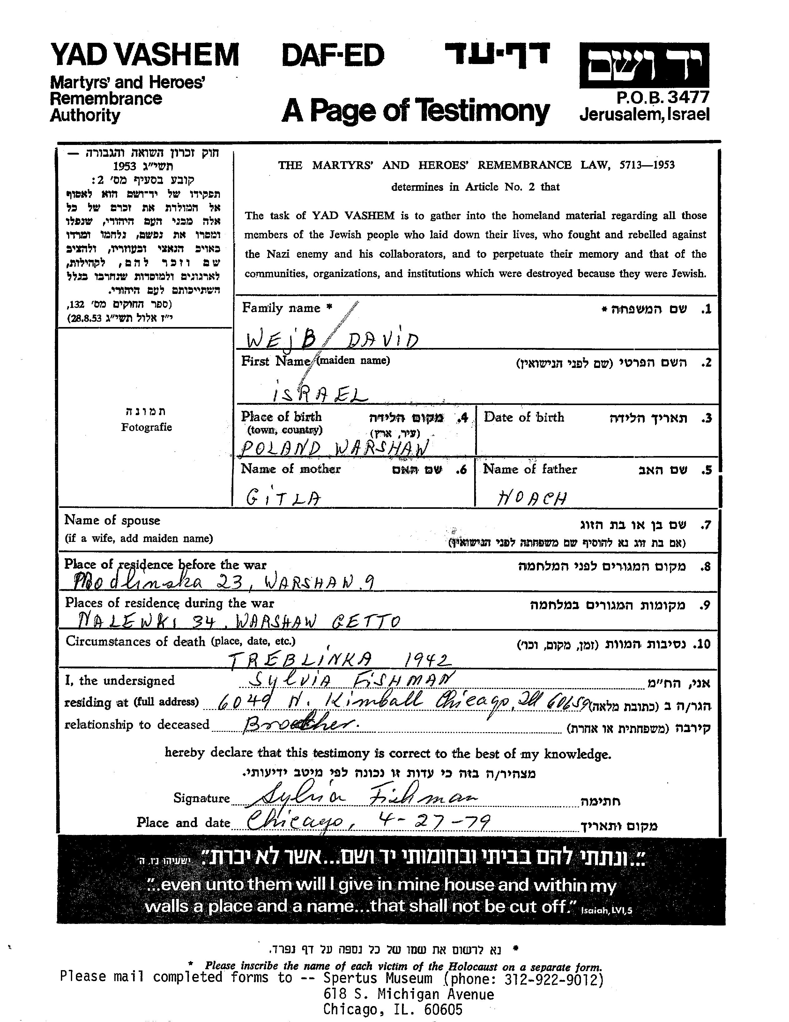 David Israel Web Wejb David wurde in Warsaw, Polen geboren. Vor dem Zweiten Weltkrieg lebte er in Warszawa, Polen.