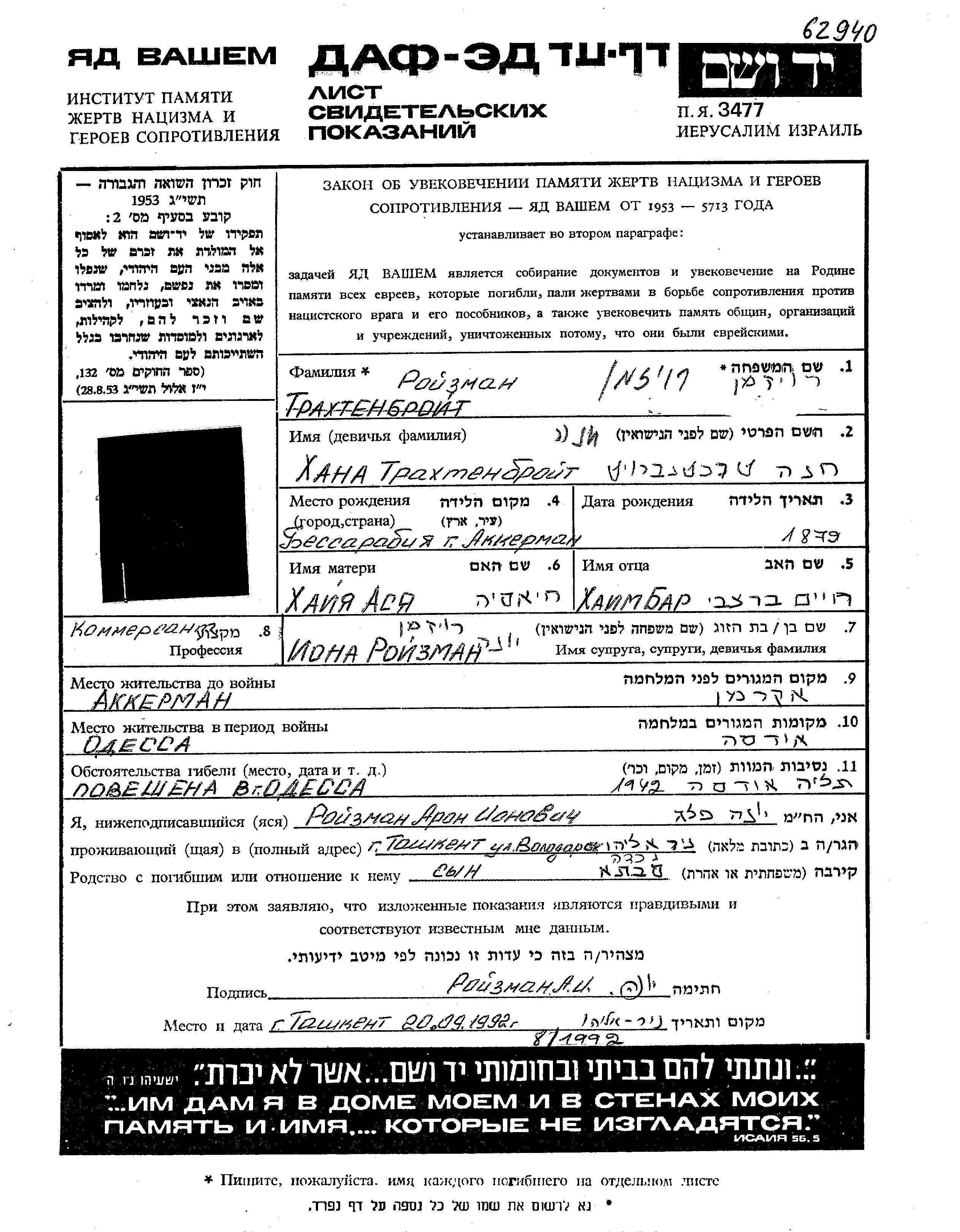 Roisman Chana 1880 Akkerman, Rumänien Gedenkblatt
