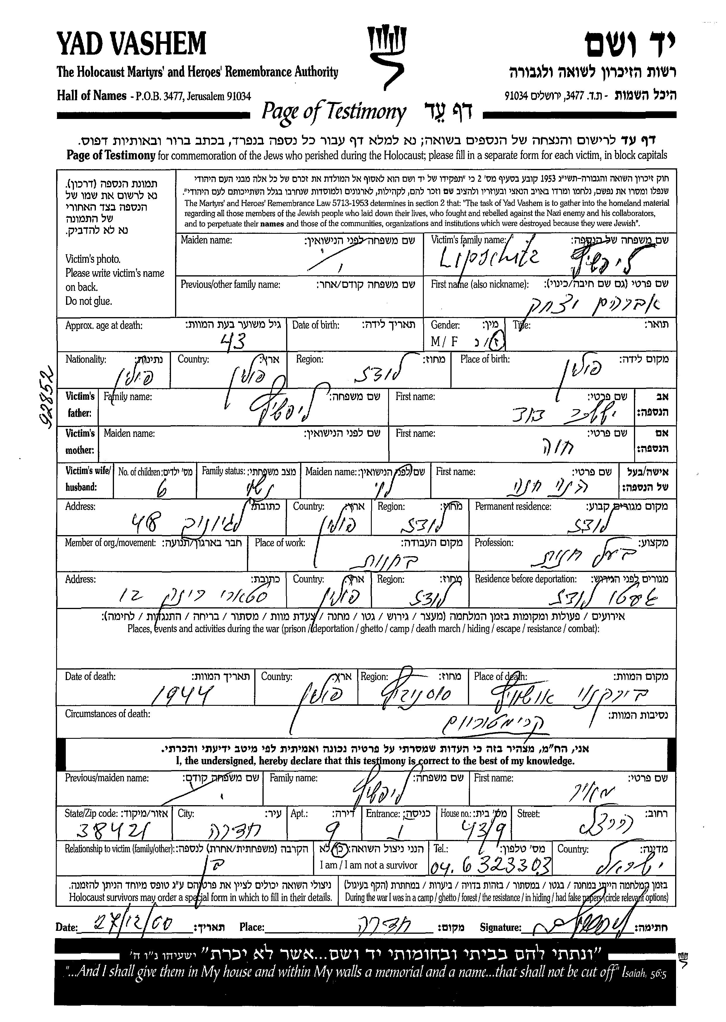 Avraham Yitzkhak Lipszyc wurde im Jahr 1904 in Lodz, Polen geboren. Er war Ladenbesitzer/-in. Vor dem Zweiten Weltkrieg lebte er in Lodz, Polen.
