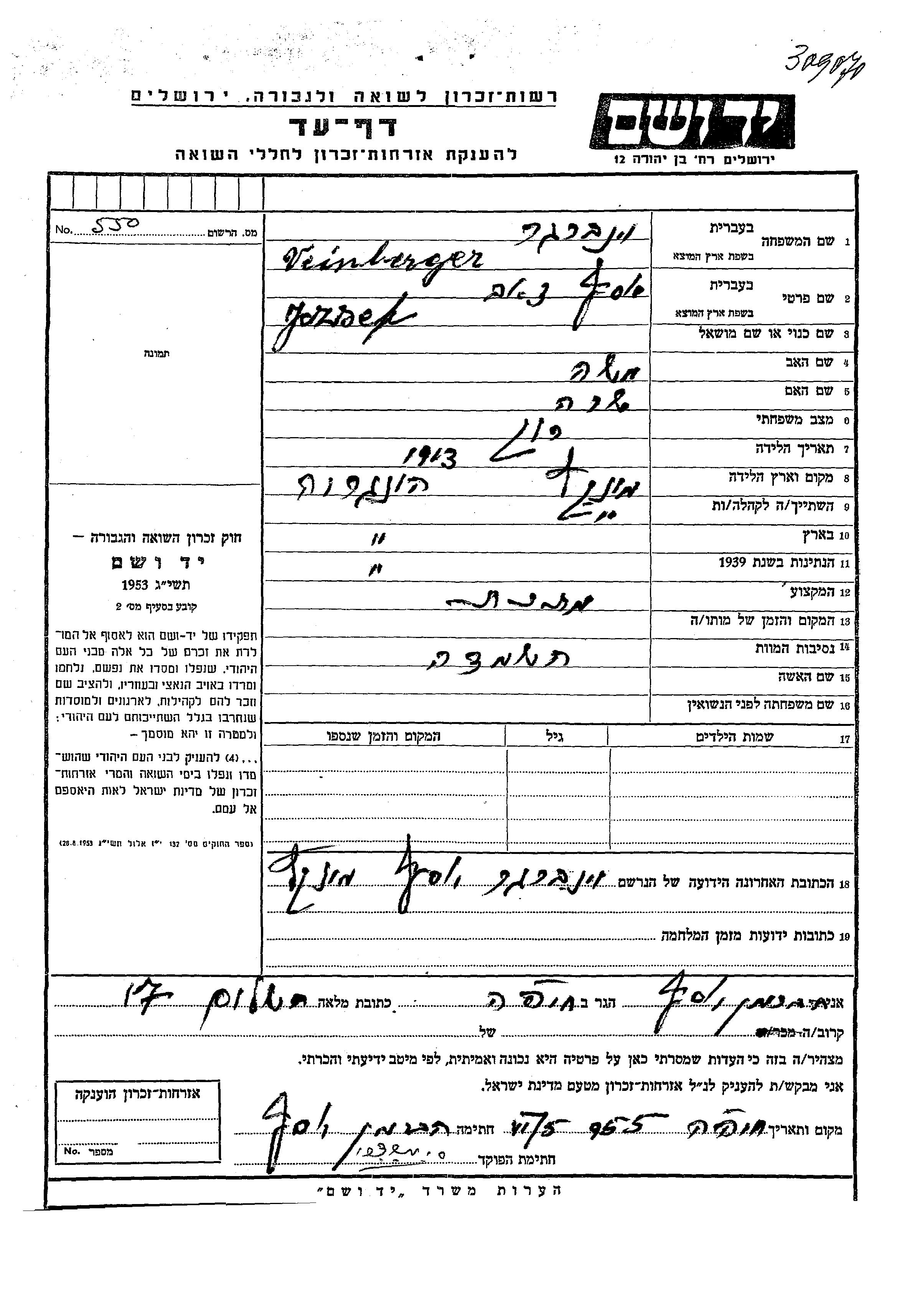 Veinberger | Yozsef Zeev | 1913 | Munkac, Tschechoslowakei | Gedenkblatt |