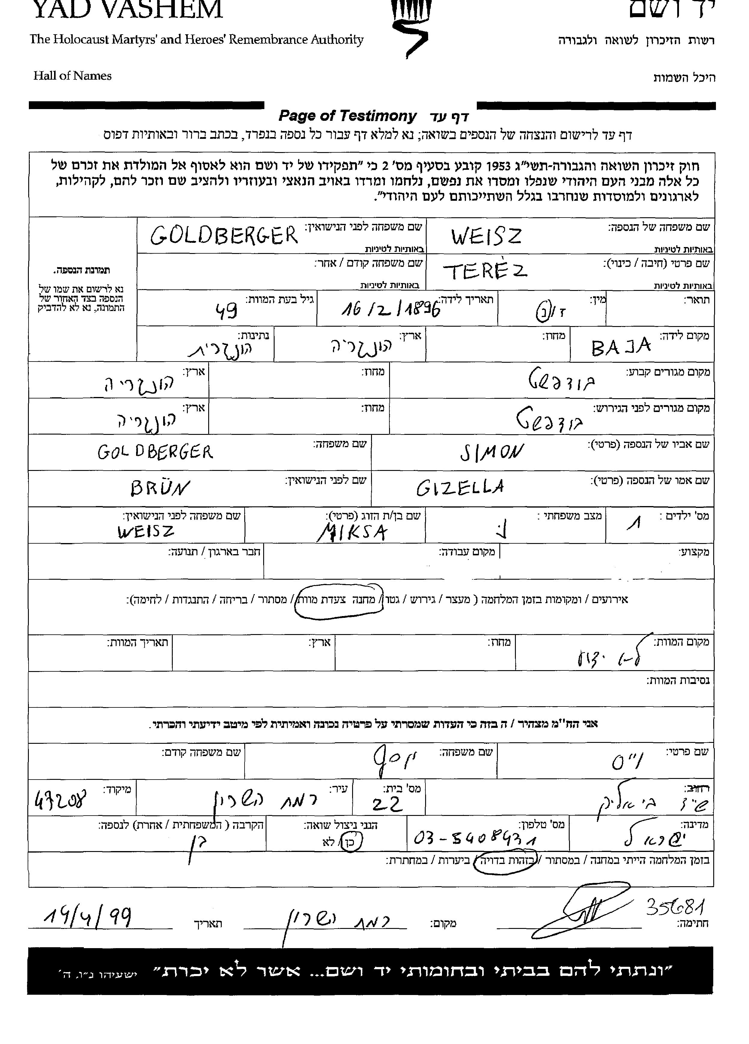 Terez Weisz, geb. Goldberger wurde im Jahr 1896 in Baja, Ungarn geboren. Sie war die Tochter von Simon und Gizella. Sie war mit Miksa Verheiratet. Vor dem Zweiten Weltkrieg lebte sie in Budapest, Ungarn. Während des Krieges war sie in Budapest, Ungarn.