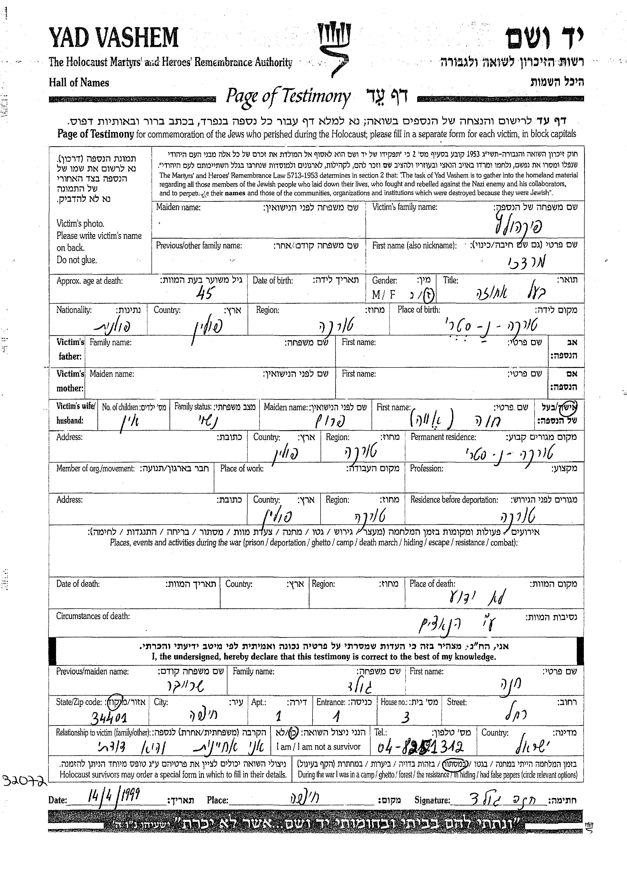 Mordekhai Pikholtz wurde in Turka nad Stryjem, Polen geboren. Er war mit Khava Eva, geb. Pruch Verheiratet. Vor dem Zweiten Weltkrieg lebte er in Turka nad Stryjem, Polen. Während des Krieges war er in Turka, Polen.