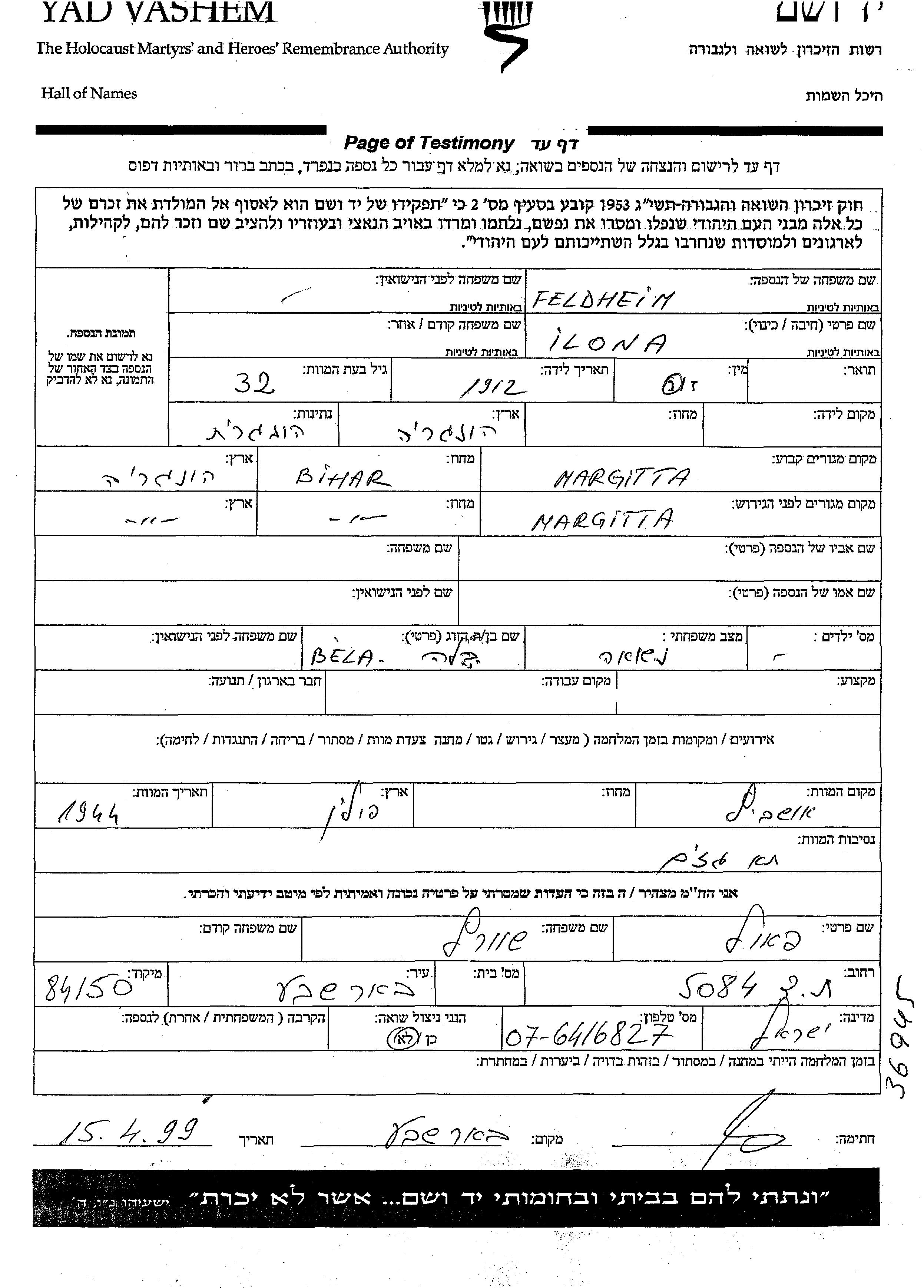 Ilona Feldheim wurde im Jahr 1912 in Ungarn geboren. Sie war mit Bela Verheiratet. Vor dem Zweiten Weltkrieg lebte sie in Margitta, Rumänien. Während des Krieges war sie in Margitta, Rumänien.