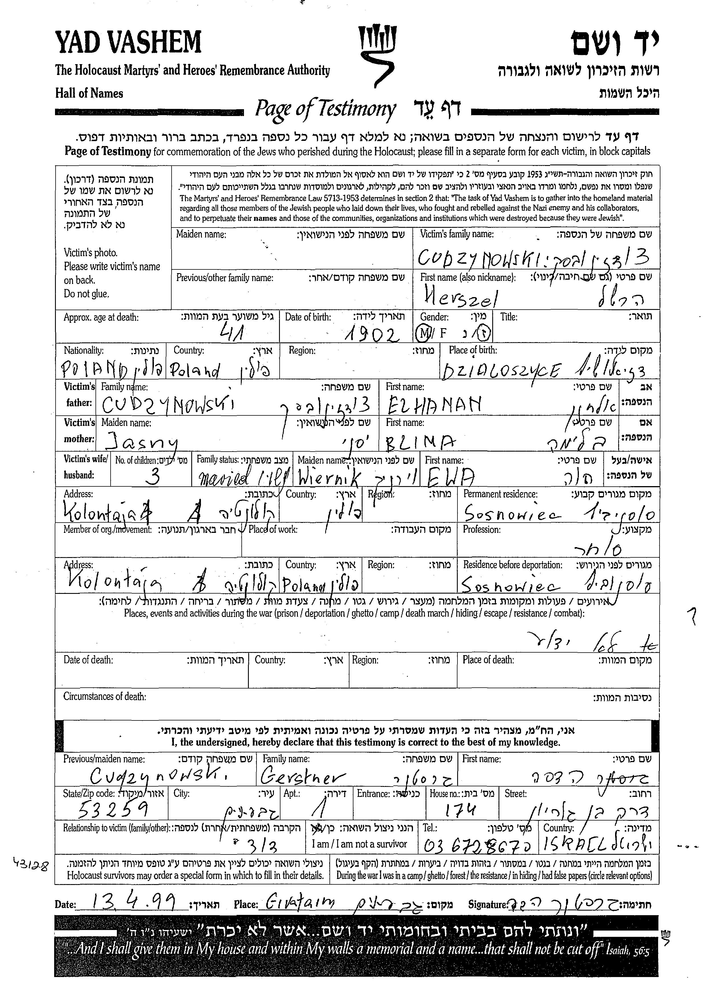 Herszel Cudzynowski wurde im Jahr 1902 in Dzialoszyce, Polen geboren. Er war der Sohn von Elhanan und Blima. Er war Kaufmann/-frau und mit Ewa Khava, geb. Wiernik Virnyk Verheiratet. Vor dem Zweiten Weltkrieg lebte er in Sosnowiec, Polen. Während des Krieges war er in Sosnowiec, Polen.