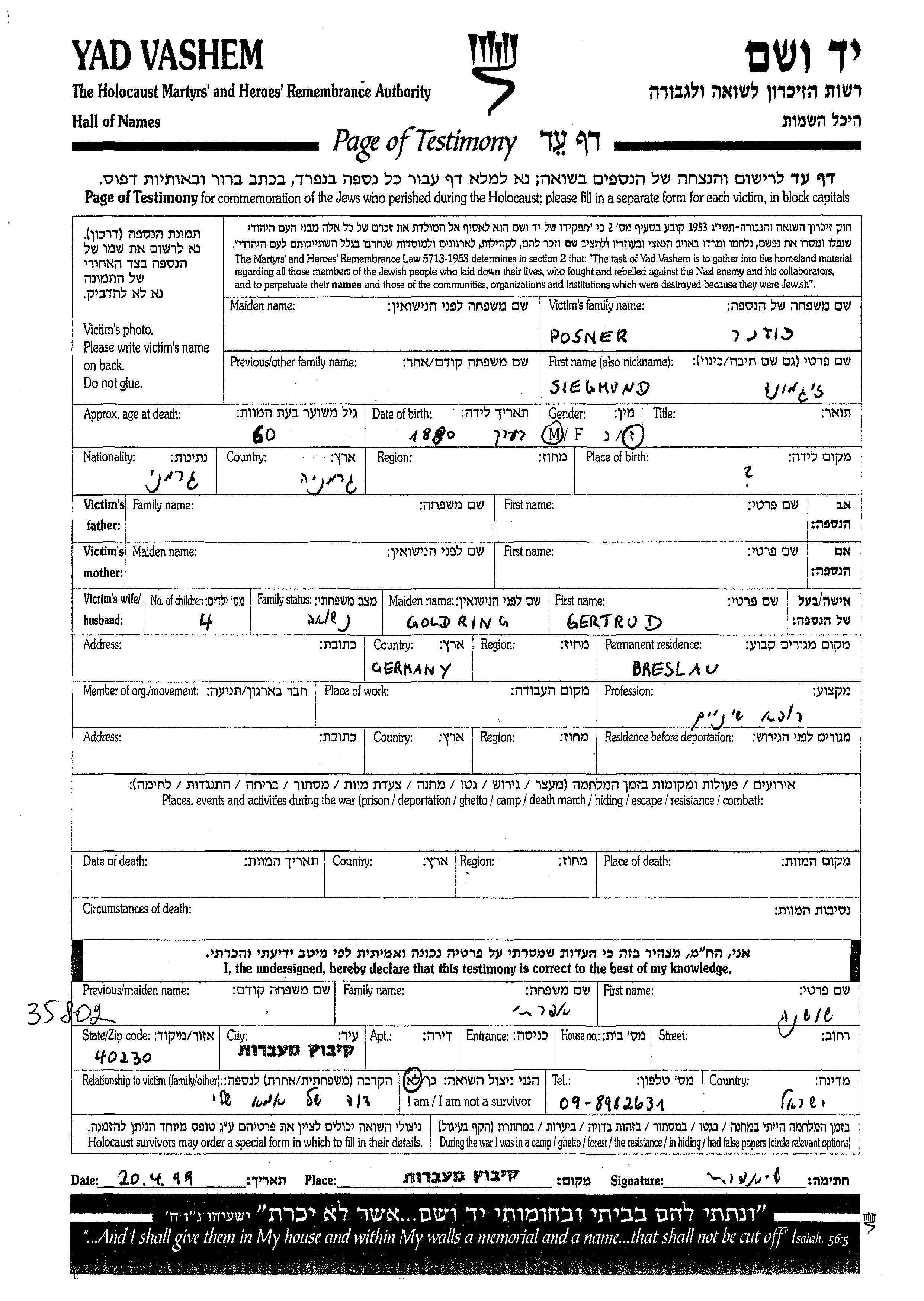 Siegmond Posner wurde im Jahr 1880 in Deutsches Reich geboren. Er war Zahnarzt/-ärztin und mit Gertrud, geb. Goldring Verheiratet. Vor dem Zweiten Weltkrieg lebte er in Breslau, Deutsches Reich.