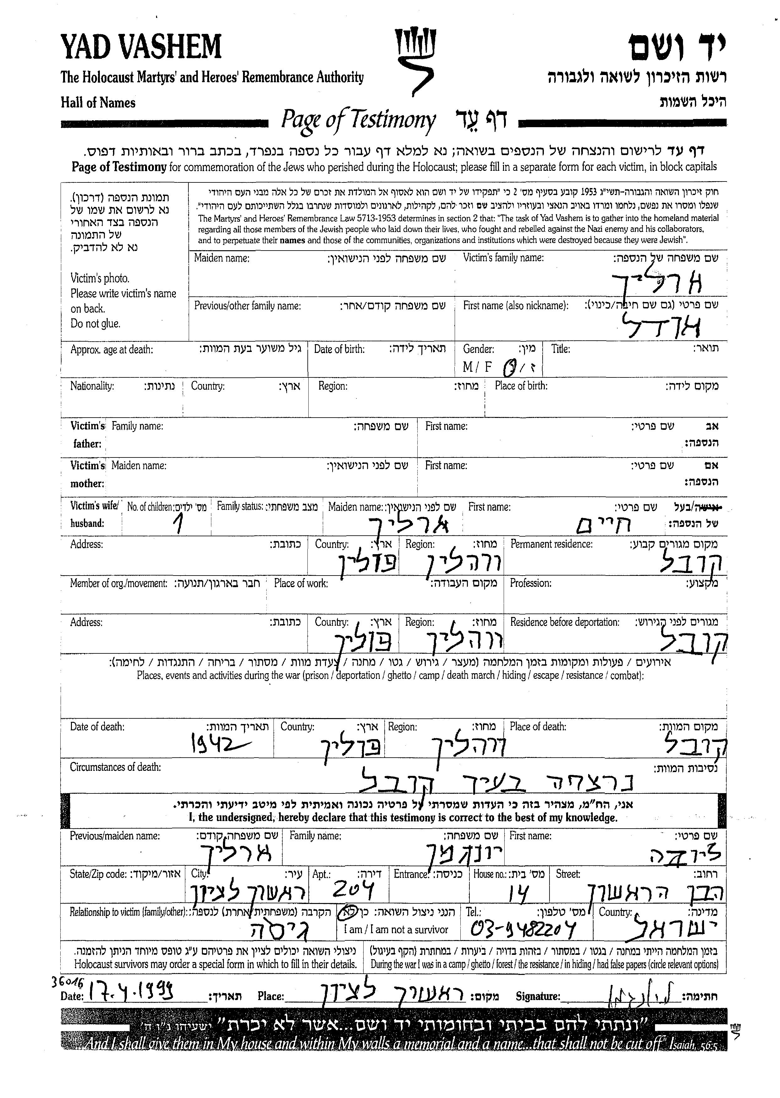 Udel Erlikh. Sie war mit Khaim, geb. Erlikh Verheiratet. Vor dem Zweiten Weltkrieg lebte sie in Kowel, Polen. Während des Krieges war sie in Kowel, Polen.