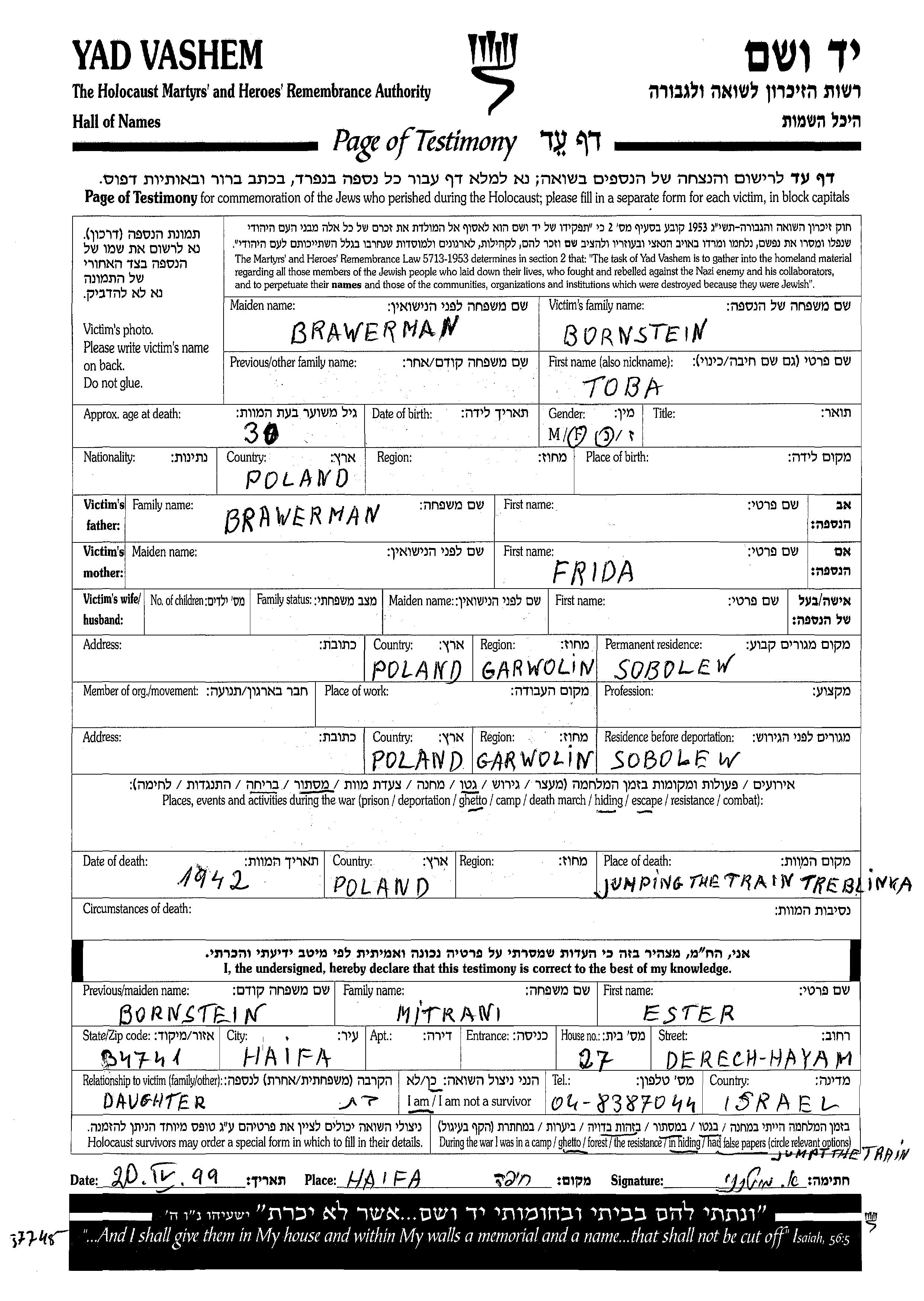 Toba Bornstein, geb. Brawerman wurde in Polen geboren. Sie war die Tochter von Frida. Vor dem Zweiten Weltkrieg lebte sie in Sobolew, Polen. Während des Krieges war sie in Sobolew, Polen.
