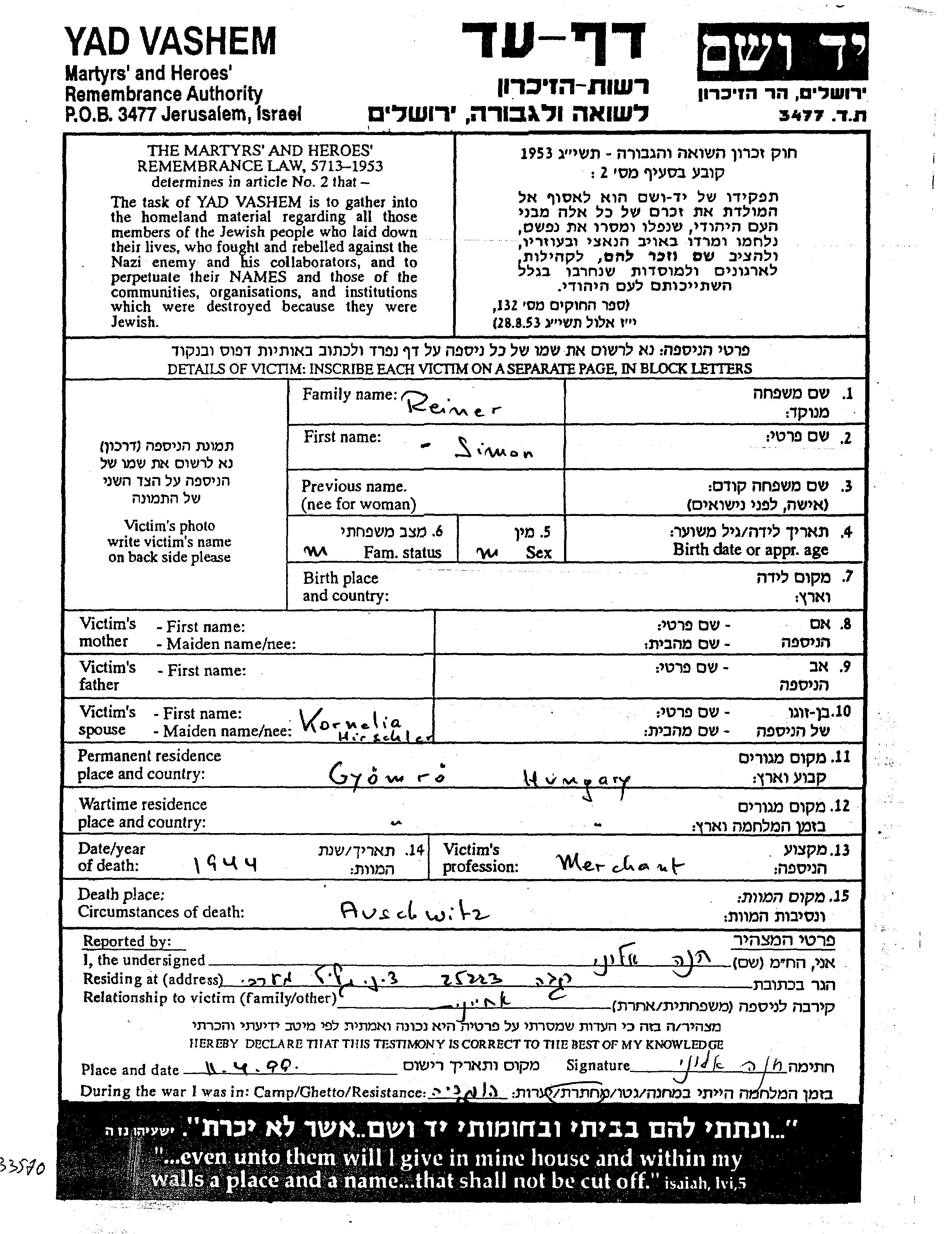 Simon Reiner. Er war Kaufmann/-frau und mit Kornelia, geb. Hirschler Verheiratet. Vor dem Zweiten Weltkrieg lebte er in Gyomro, Ungarn. Während des Krieges war er in Gyomro, Ungarn.