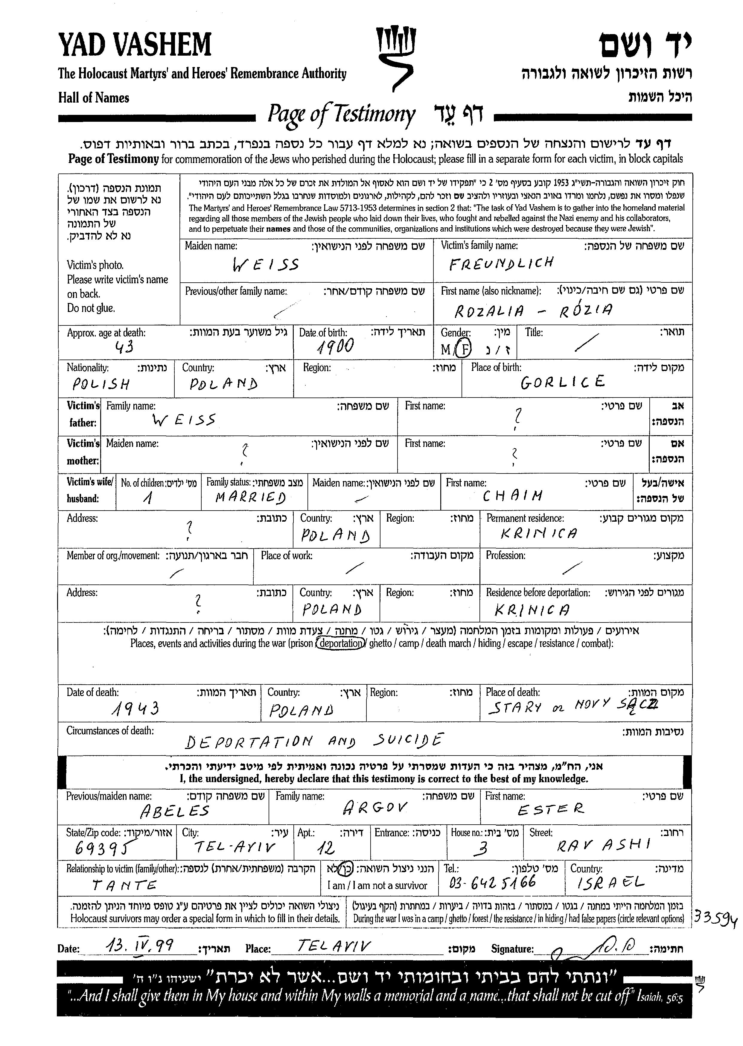 Rozalia Freundlich, geb. Weiss wurde im Jahr 1900 in Gorlice, Polen geboren. Sie war mit Chaim Verheiratet. Vor dem Zweiten Weltkrieg lebte sie in Krinica, Polen. Während des Krieges war sie in Krinica, Polen.