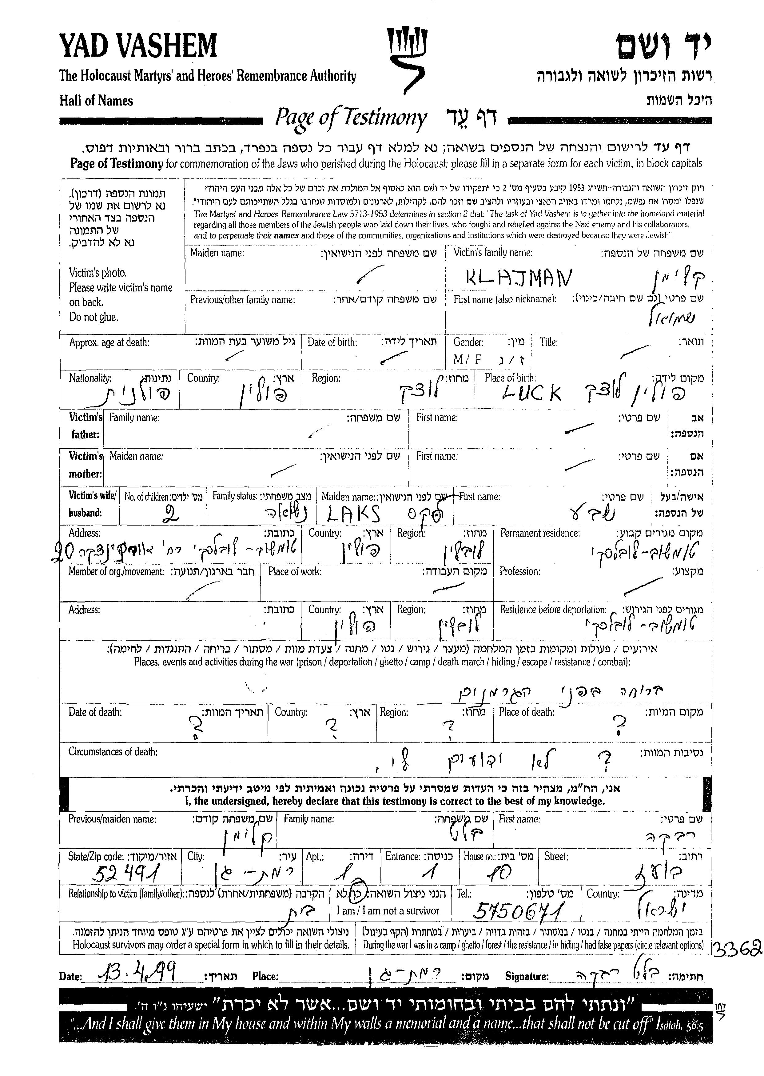 Shmuel Klajman wurde in Luck, Polen geboren. Er war mit Sheva, geb. Laks Verheiratet. Vor dem Zweiten Weltkrieg lebte er in Tomaszow Lubelski, Polen. Während des Krieges war er in Tomaszow Lubelski, Polen.