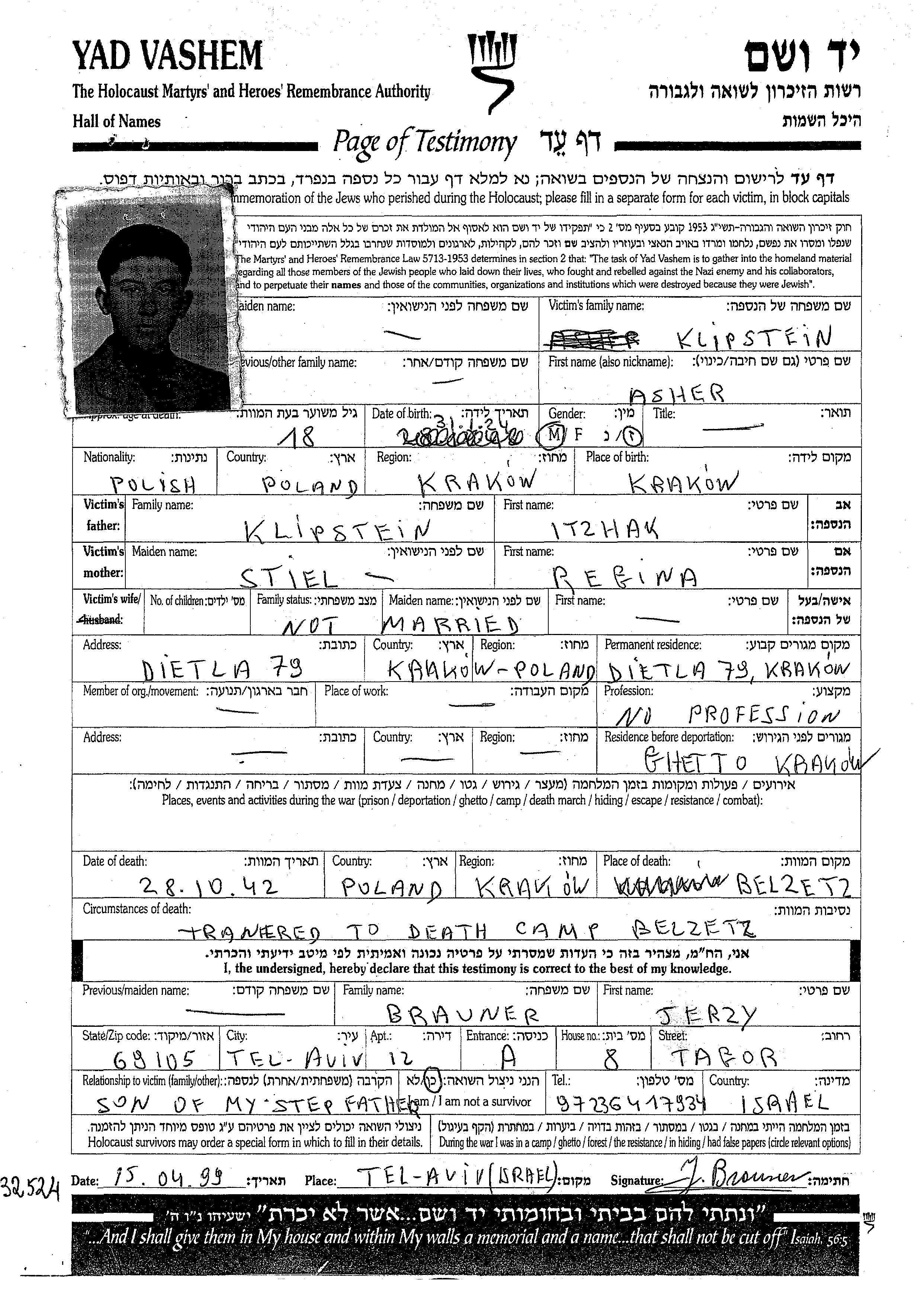 Asher Klipstein wurde im Jahr 1924 in Krakow, Polen geboren. Er war der Sohn von Itzhak und Regina. Er war Ledig. Vor dem Zweiten Weltkrieg lebte er in Krakow, Polen. Während des Krieges war er in Krakow, Polen.
