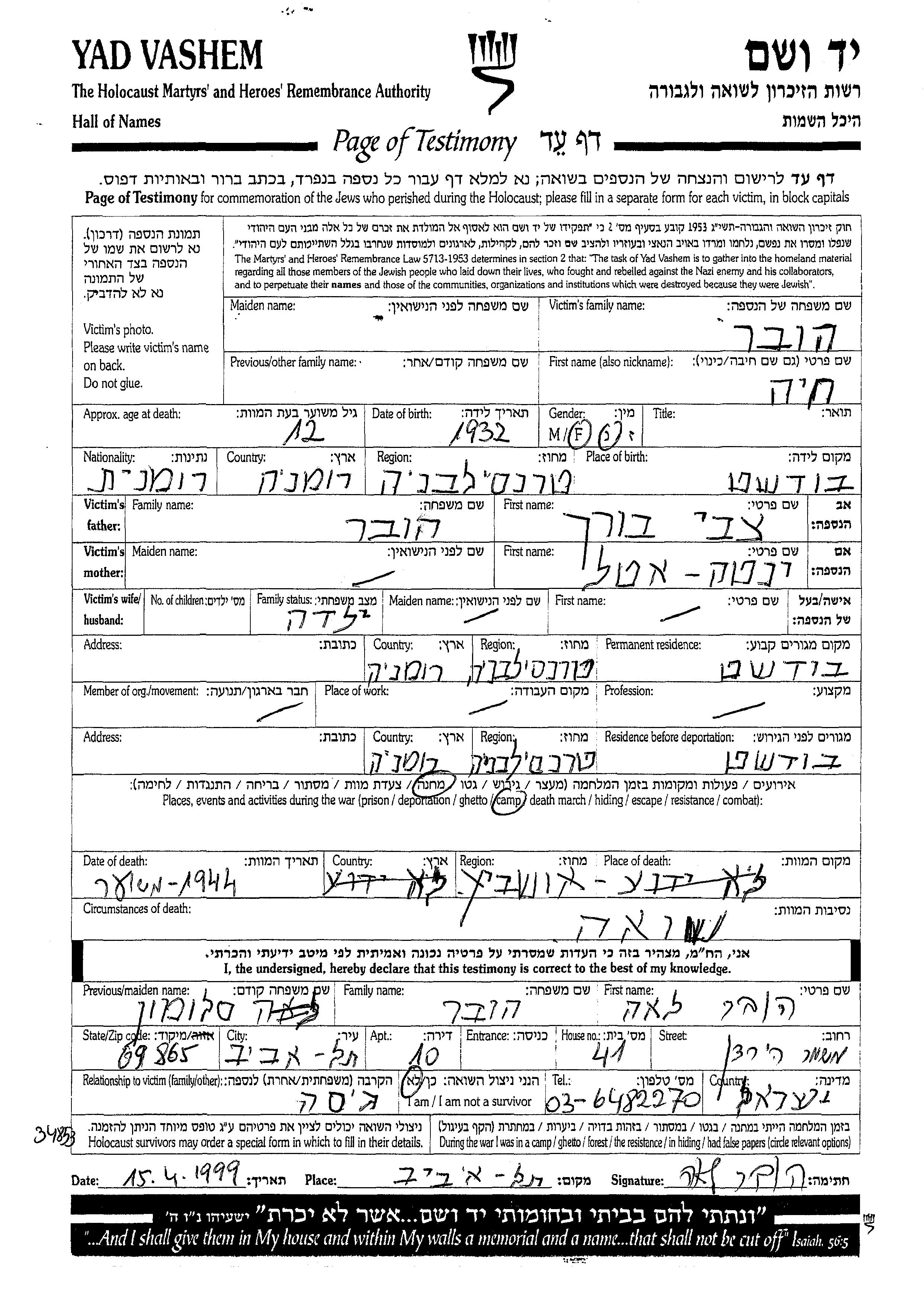 Huber Khaia 1932 Budesti, Rumänien Gedenkblatt