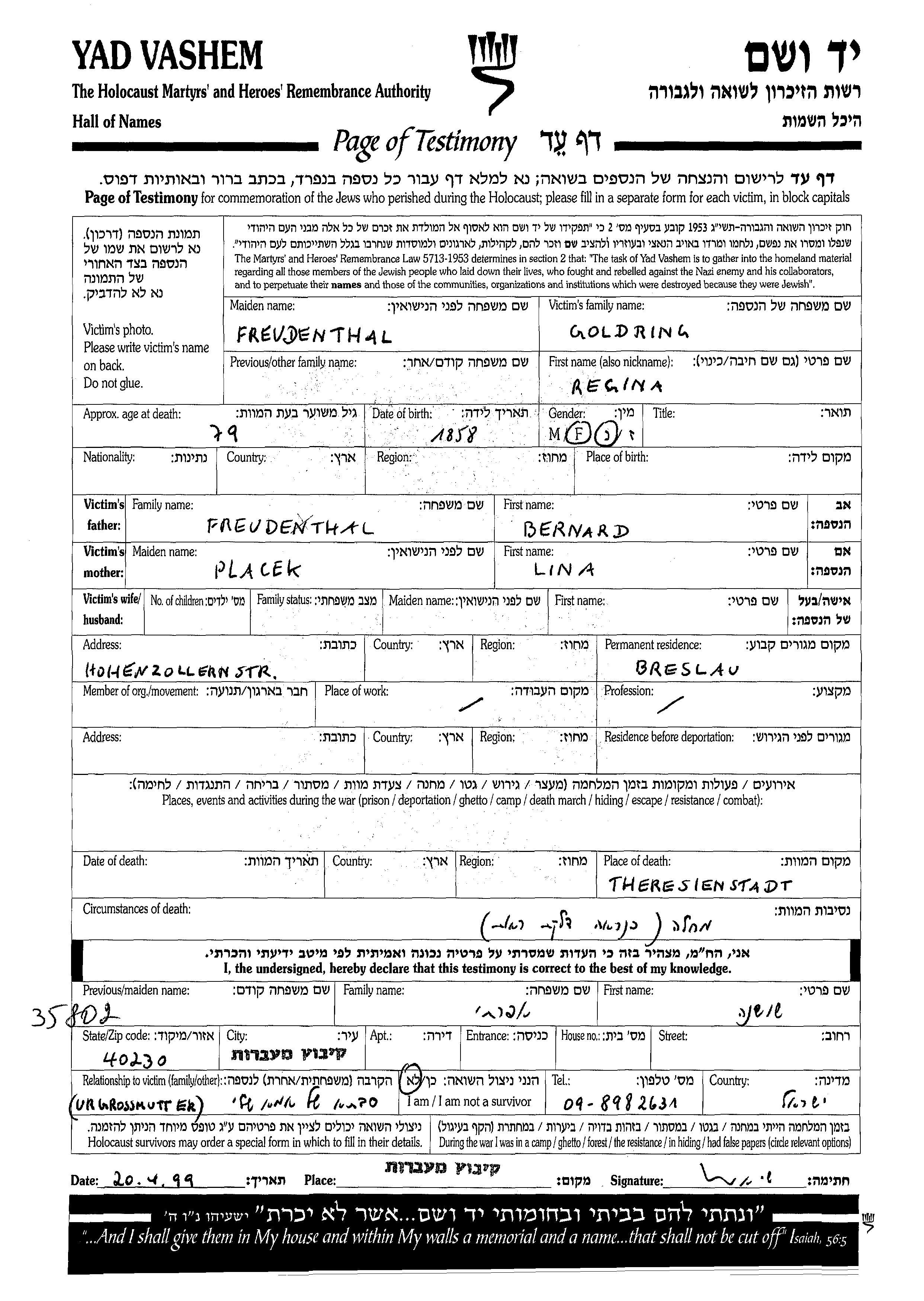 Regina wurde in der Schoah ermordet. Todesort: Theresienstadt, Tschechoslowakei.