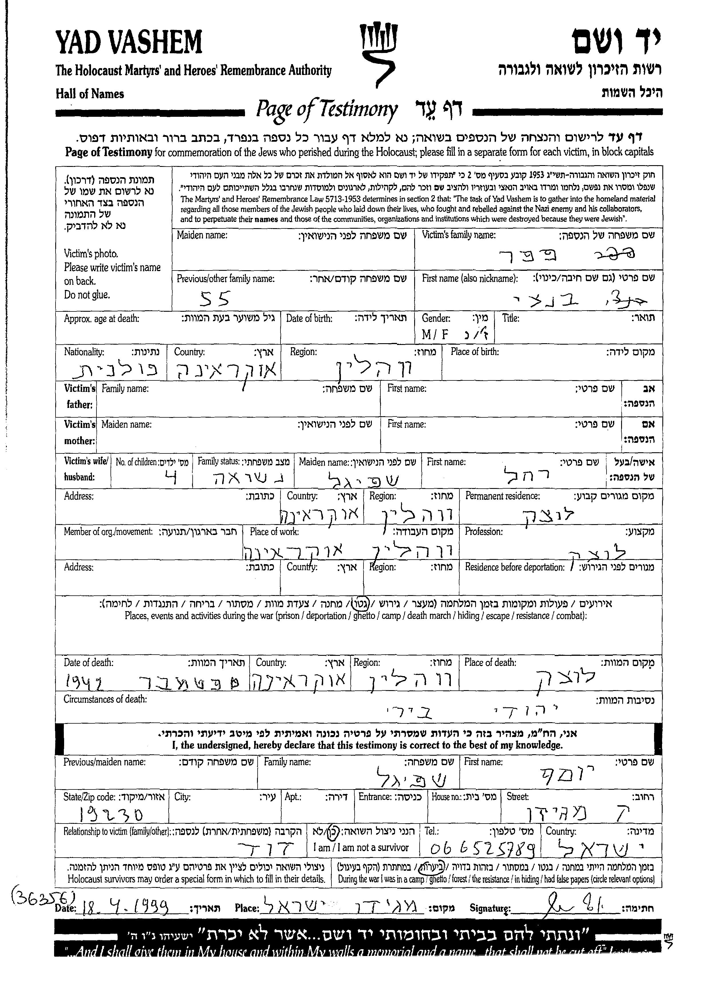 Bentzi Fefer wurde in Wolyn, Polen geboren. Er war mit Rakhel, geb. Shpigel Verheiratet. Vor dem Zweiten Weltkrieg lebte er in Luck, Polen. Während des Krieges war er in Luck, Polen.