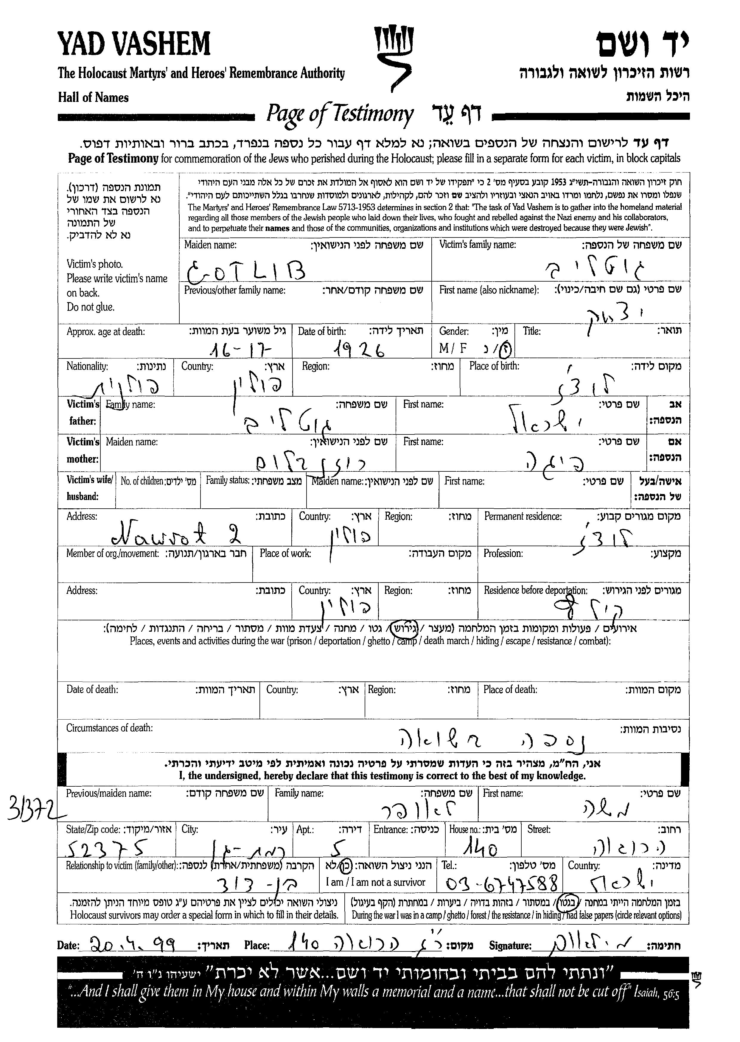 Gotlib Yitzkhak 1926 Lodz, Polen Gedenkblatt