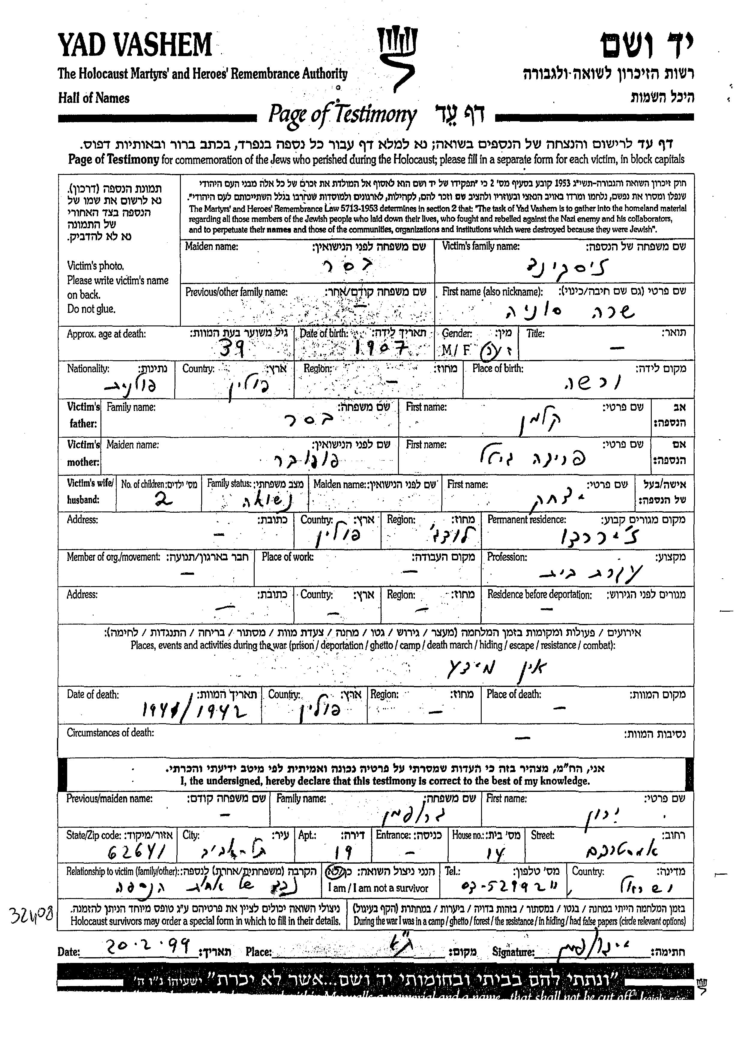 Sara Sonia wurde in der Schoah ermordet. Todesort: Polen im Jahr 1941.