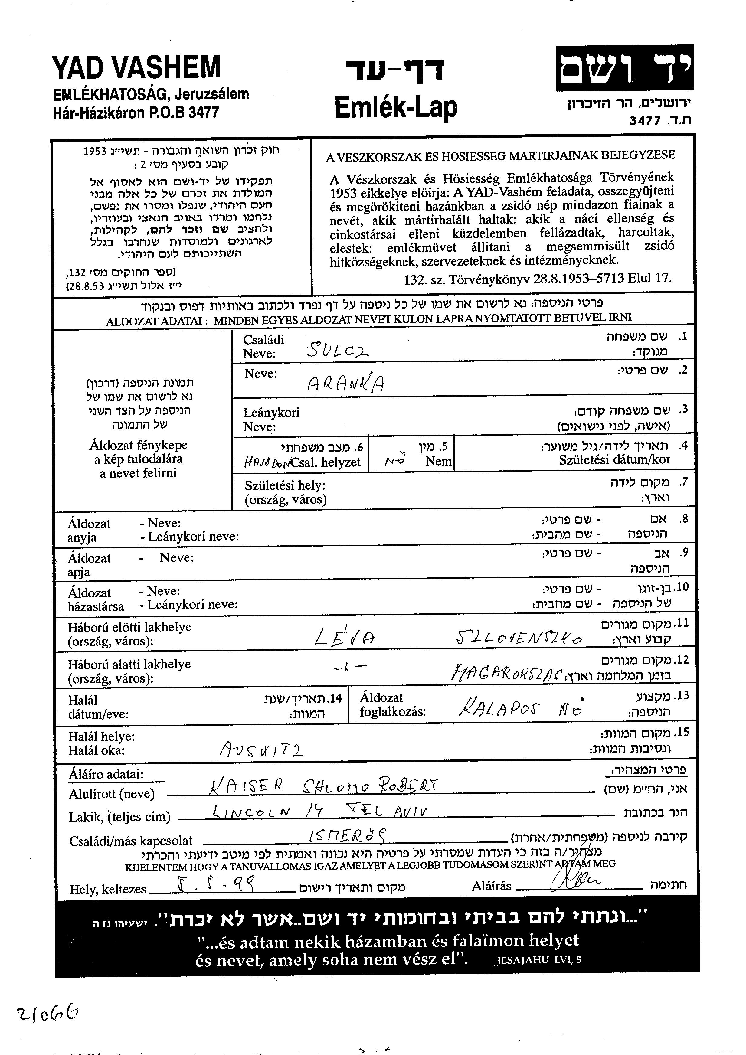 Aranka Sulcz. Sie war Ledig. Vor dem Zweiten Weltkrieg lebte sie in Leva, Tschechoslowakei. Während des Krieges war sie in Leva, Tschechoslowakei.