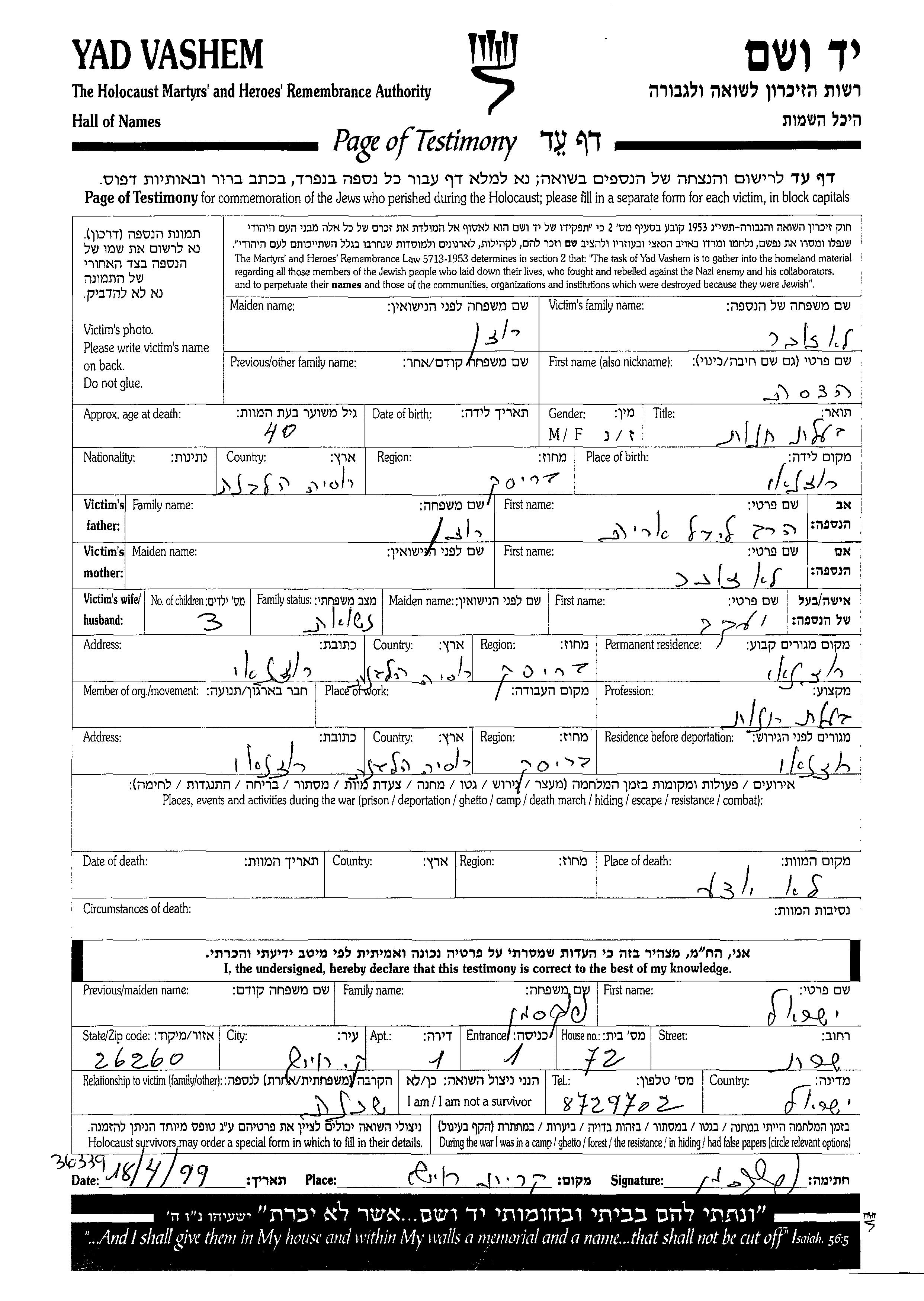 Hadasa Name unbekannt, geb. Rozen wurde in Rozany, Polen geboren. Sie war die Tochter von Herbert Leibel. Sie war Ladenbesitzer/-in und mit Yaakov Verheiratet. Vor dem Zweiten Weltkrieg lebte sie in Rozany, Polen. Während des Krieges war sie in Rozany, Polen.