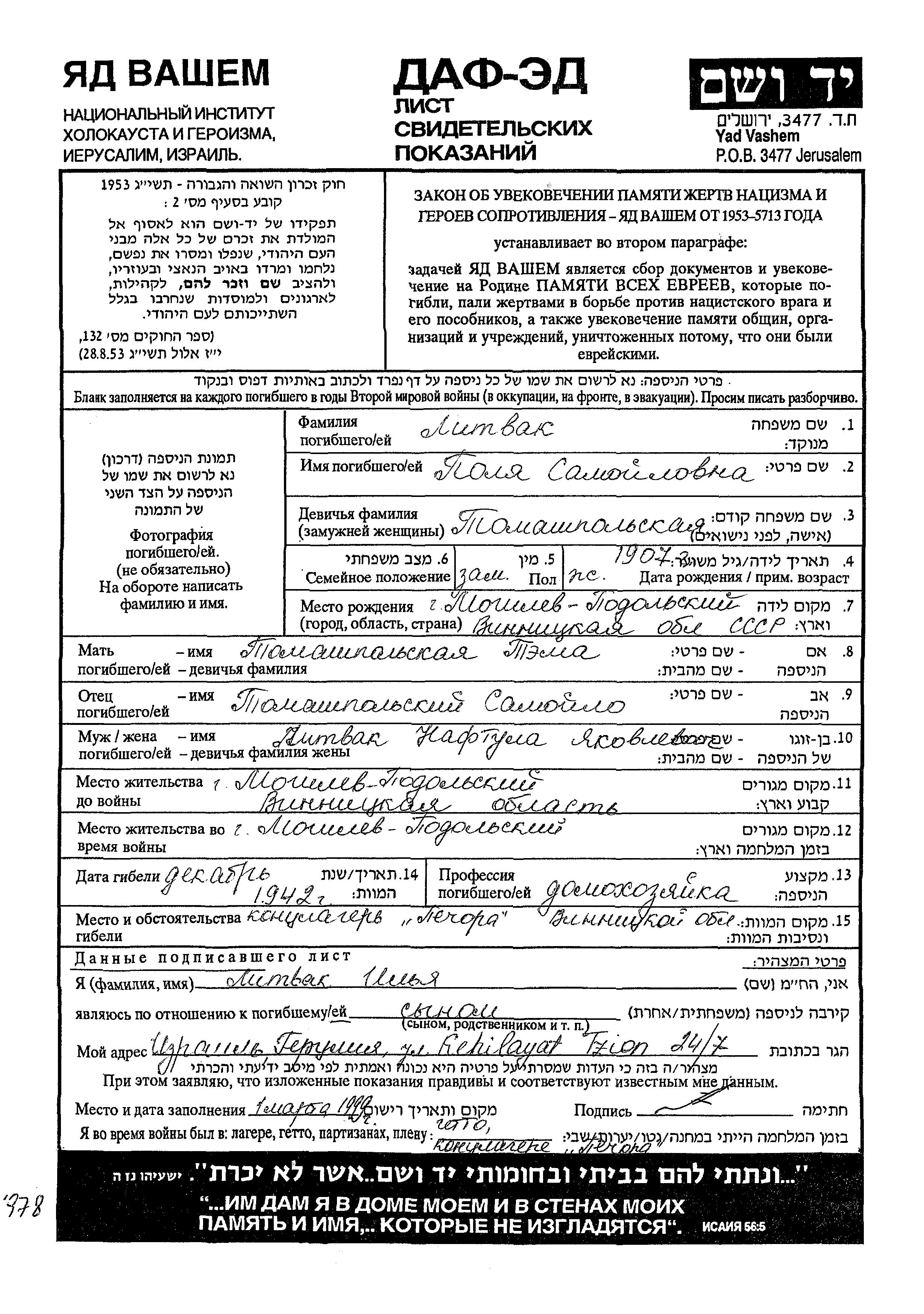 Polya Litvak, geb. Tomashpolskaya wurde im Jahr 1907 in Mogilev Podolski, Ukraine (UdSSR) geboren. Sie war die Tochter von Shmuel und Tema. Sie war Hausfrau und mit Naftula Verheiratet. Vor dem Zweiten Weltkrieg lebte sie in Mogilev Podolski, Ukraine (UdSSR). Während des Krieges war sie in Mogilev Podolski, Ukraine (UdSSR).