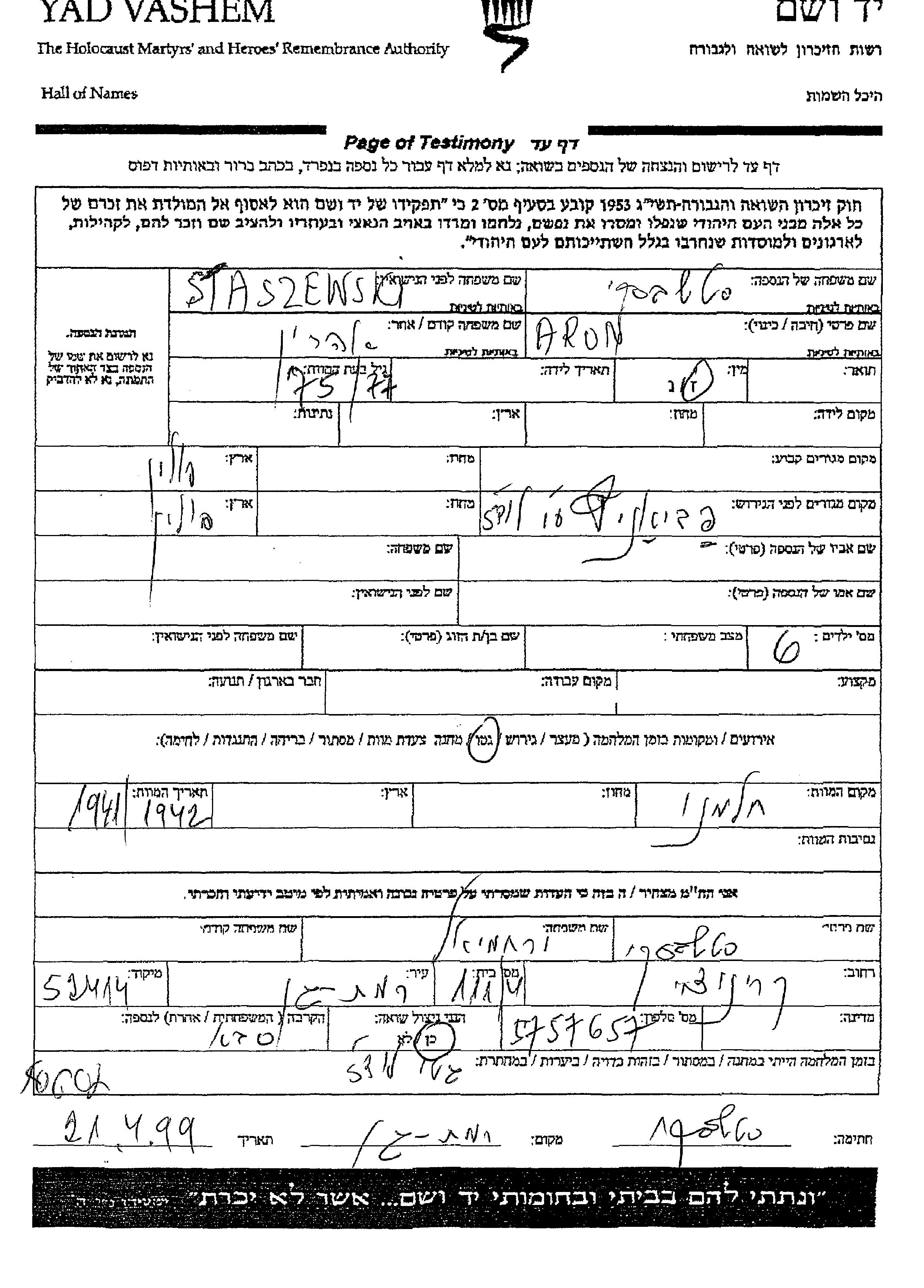 Aron Staszewski. Er war Verheiratet. Vor dem Zweiten Weltkrieg lebte er in Polen. Während des Krieges war er in Pabianice, Polen.