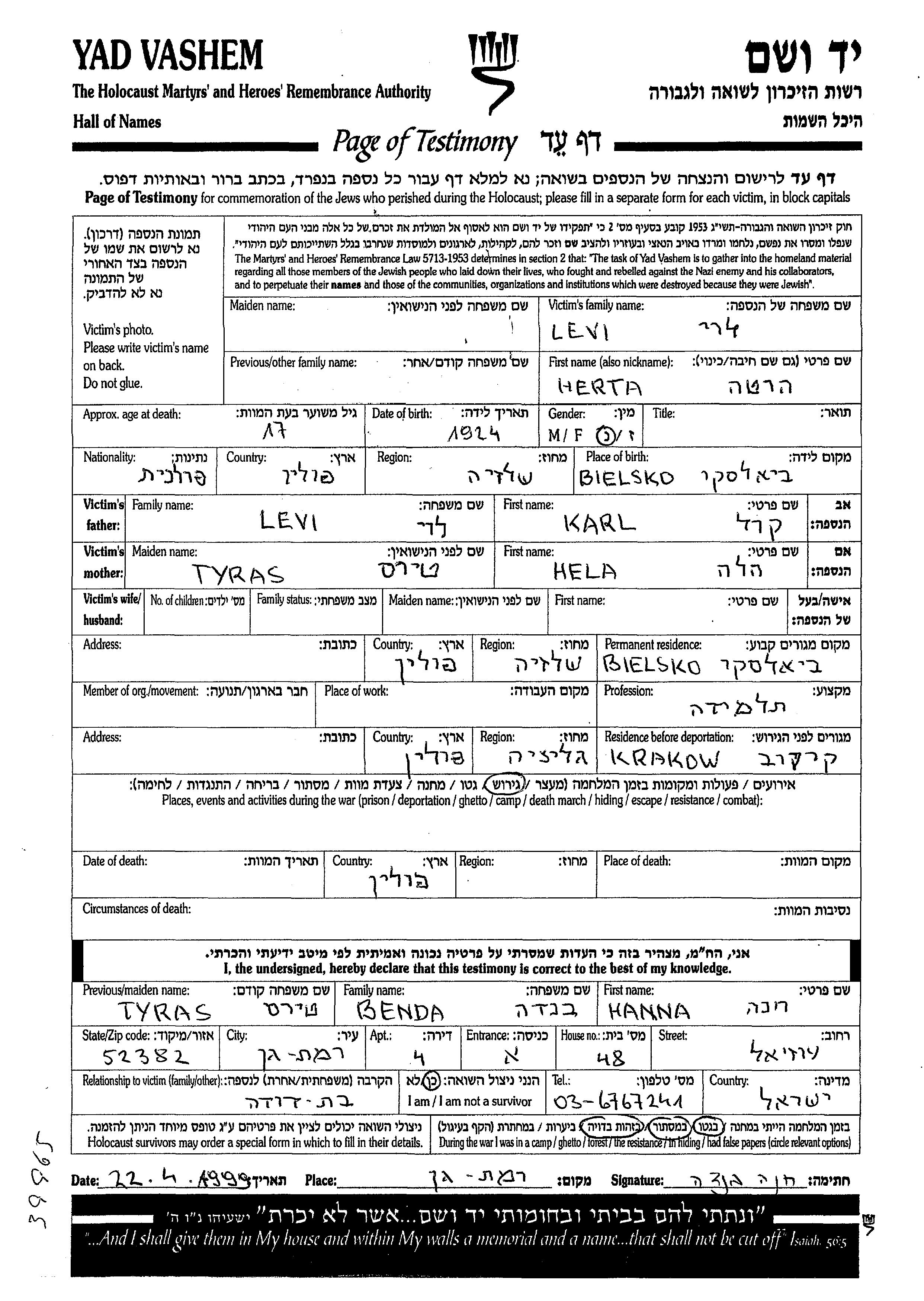 Herta Levi wurde im Jahr 1924 in Bielsko, Polen geboren. Sie war die Tochter von Karl und Hela. Sie war Schüler/-in. Vor dem Zweiten Weltkrieg lebte sie in Bielsko, Polen. Während des Krieges war sie in Krakow, Polen.