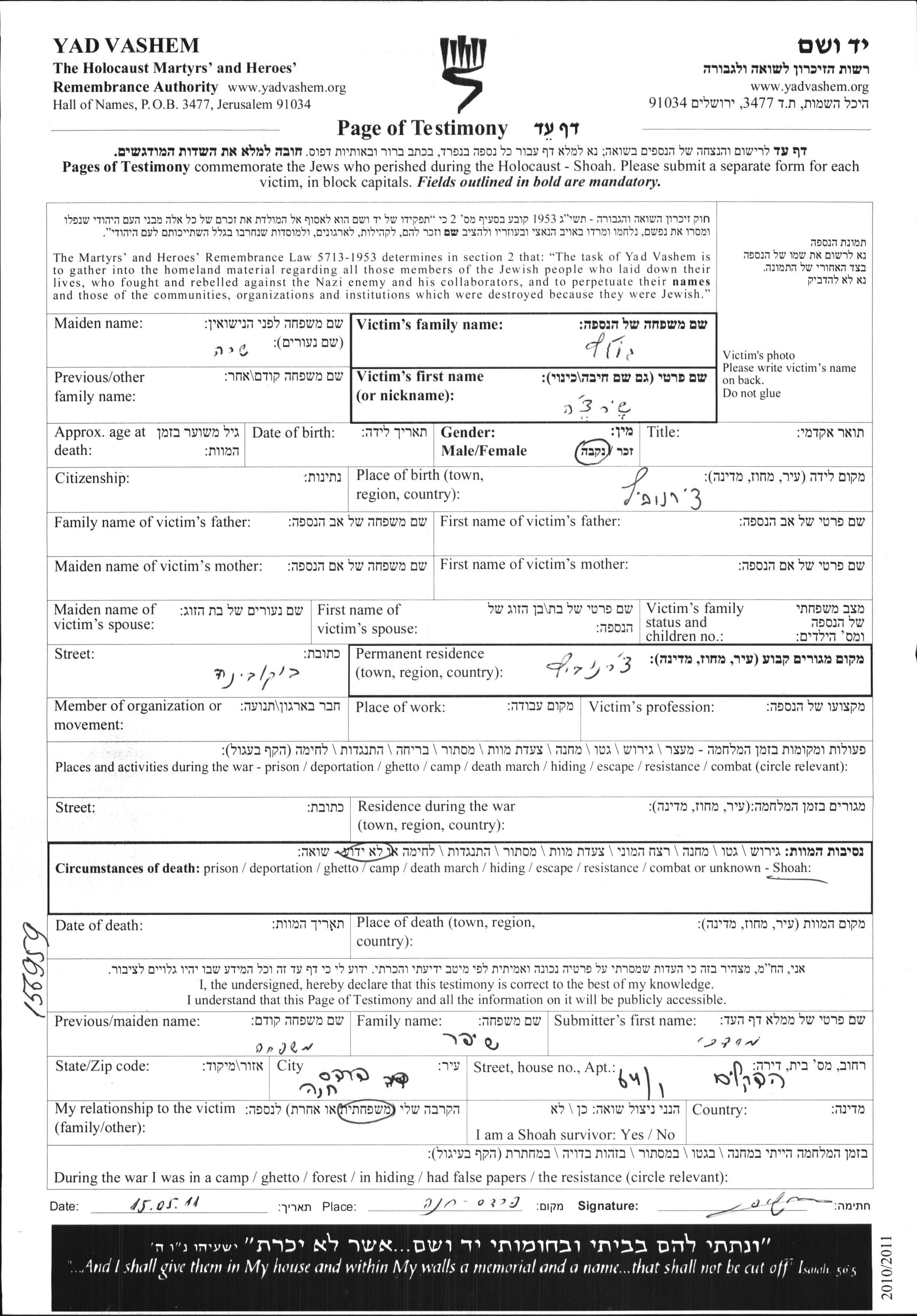 Sara Goltz, geb. Shia wurde in Czernovitz, Rumänien geboren. Vor dem Zweiten Weltkrieg lebte sie in Czernovitz, Rumänien.