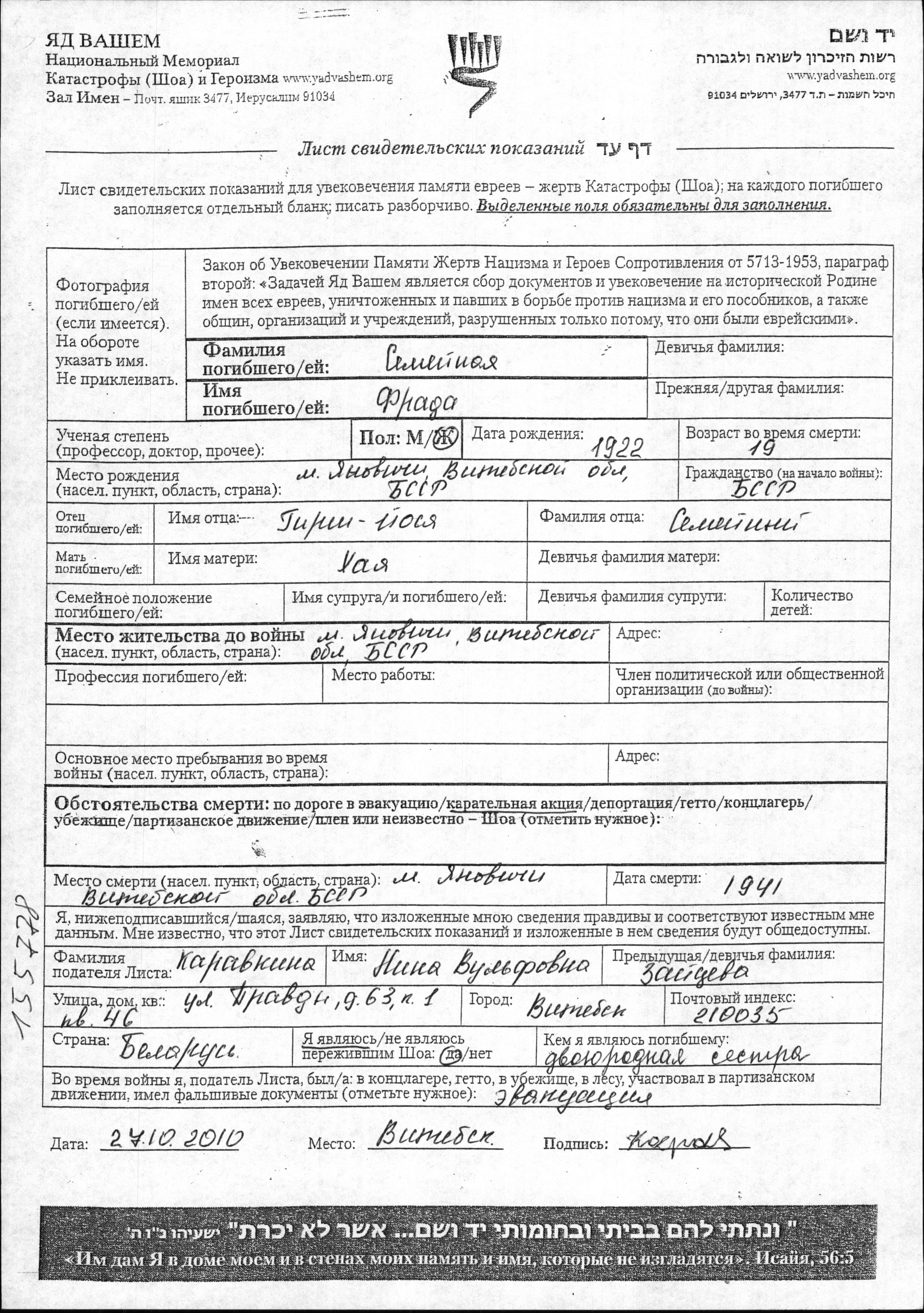 Frada Semeynaya wurde im Jahr 1922 in Yanovichi, Weißrussland (UdSSR) geboren. Sie war die Tochter von Girsh Yosya und Khaya. Vor dem Zweiten Weltkrieg lebte sie in Yanovichi, Weißrussland (UdSSR). Während des Krieges war sie in Yanovichi, Weißrussland (UdSSR).
