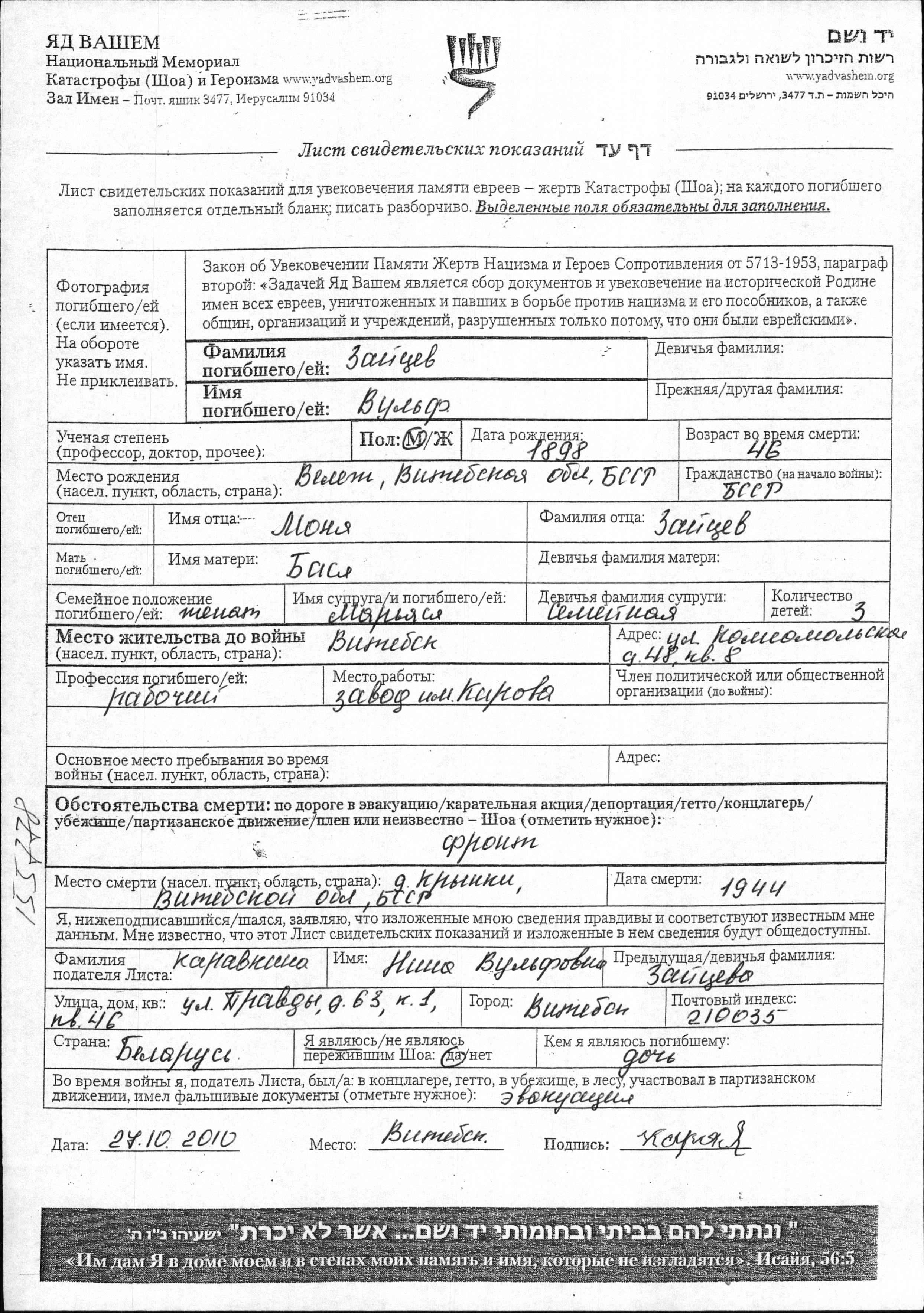 Vulf Zaytzev wurde im Jahr 1898 in Velizh, Russland (UdSSR) geboren. Er war der Sohn von Monya und Basya. Er war Arbeiter/-in und mit Mariyasya, geb. Semeynaya Verheiratet. Vor dem Zweiten Weltkrieg lebte er in Vitebsk, Weißrussland (UdSSR). Während des Krieges war er in die Sowjetischen Streitkräfte. Vulf im Militärdienst umgekommen. Todesort: Krynki, Weißrussland (UdSSR) im Jahr 1944.