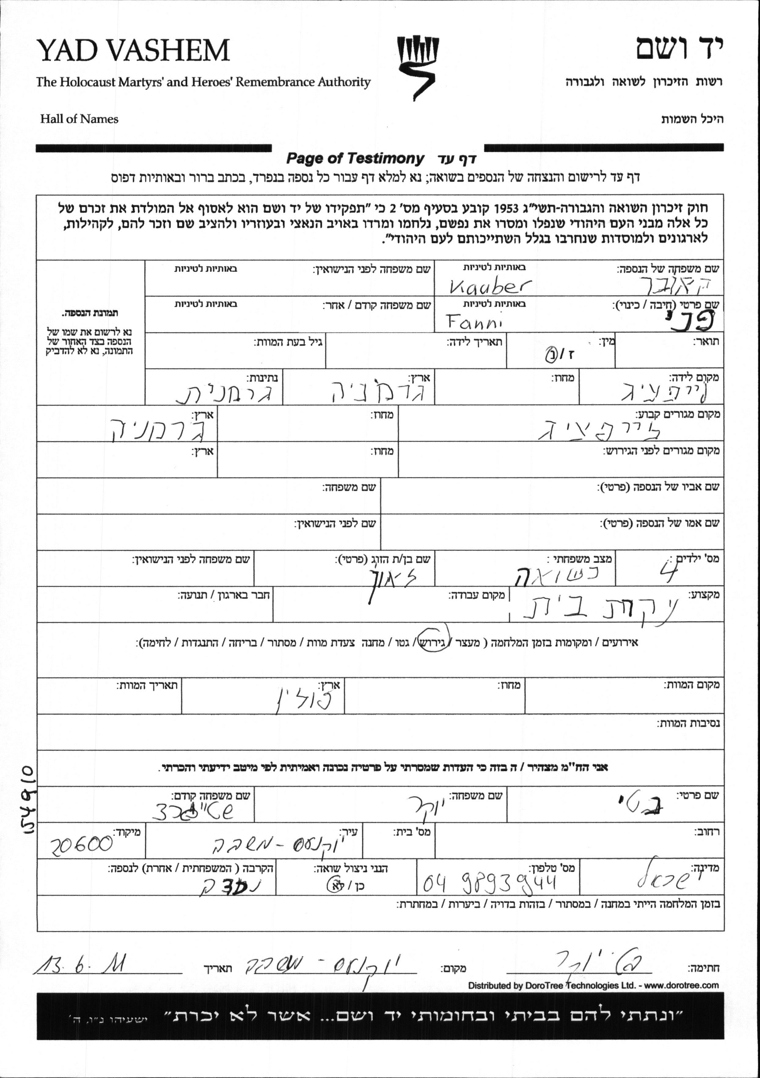 Fanni Fani Kauber wurde in Leipzig, Deutsches Reich geboren. Sie war Hausfrau und mit Leon Verheiratet. Vor dem Zweiten Weltkrieg lebte sie in Leipzig, Deutsches Reich.