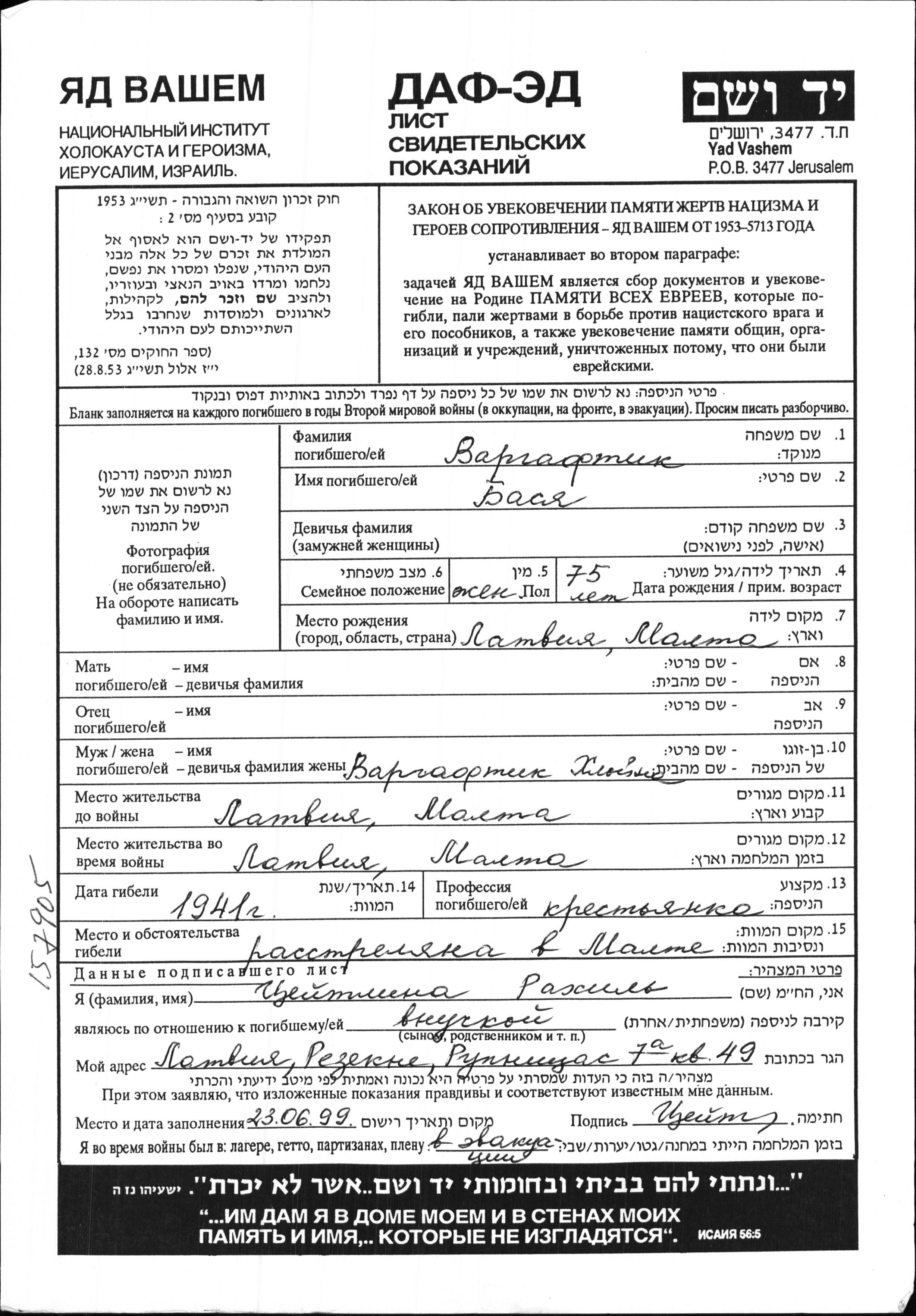 Basya Vargaftik wurde in Malta, Lettland geboren. Sie war mit Khloyna Verheiratet. Vor dem Zweiten Weltkrieg lebte sie in Malta, Lettland. Während des Krieges war sie in Malta, Lettland.
