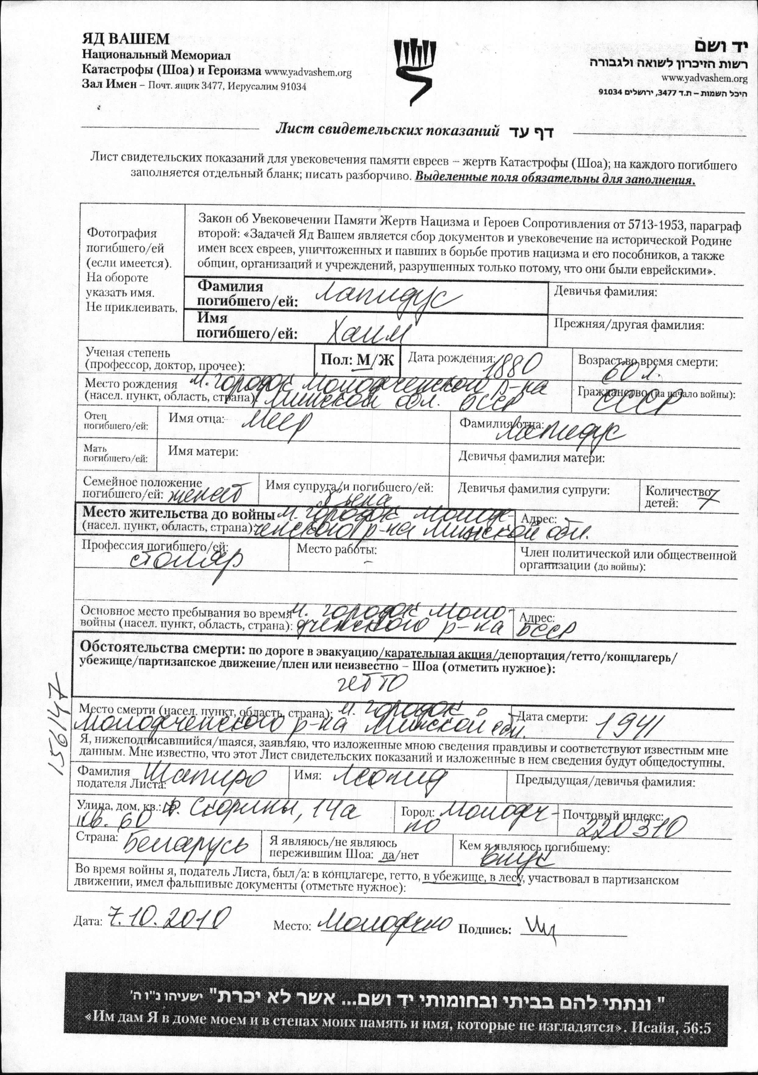 Khaim Lapidus wurde im Jahr 1880 in Gorodok, Polen geboren. Er war der Sohn von Meyer. Er war Tischler und mit Khyena Verheiratet. Vor dem Zweiten Weltkrieg lebte er in Gorodok, Polen. Während des Krieges war er in Getto, Weißrussland (UdSSR).