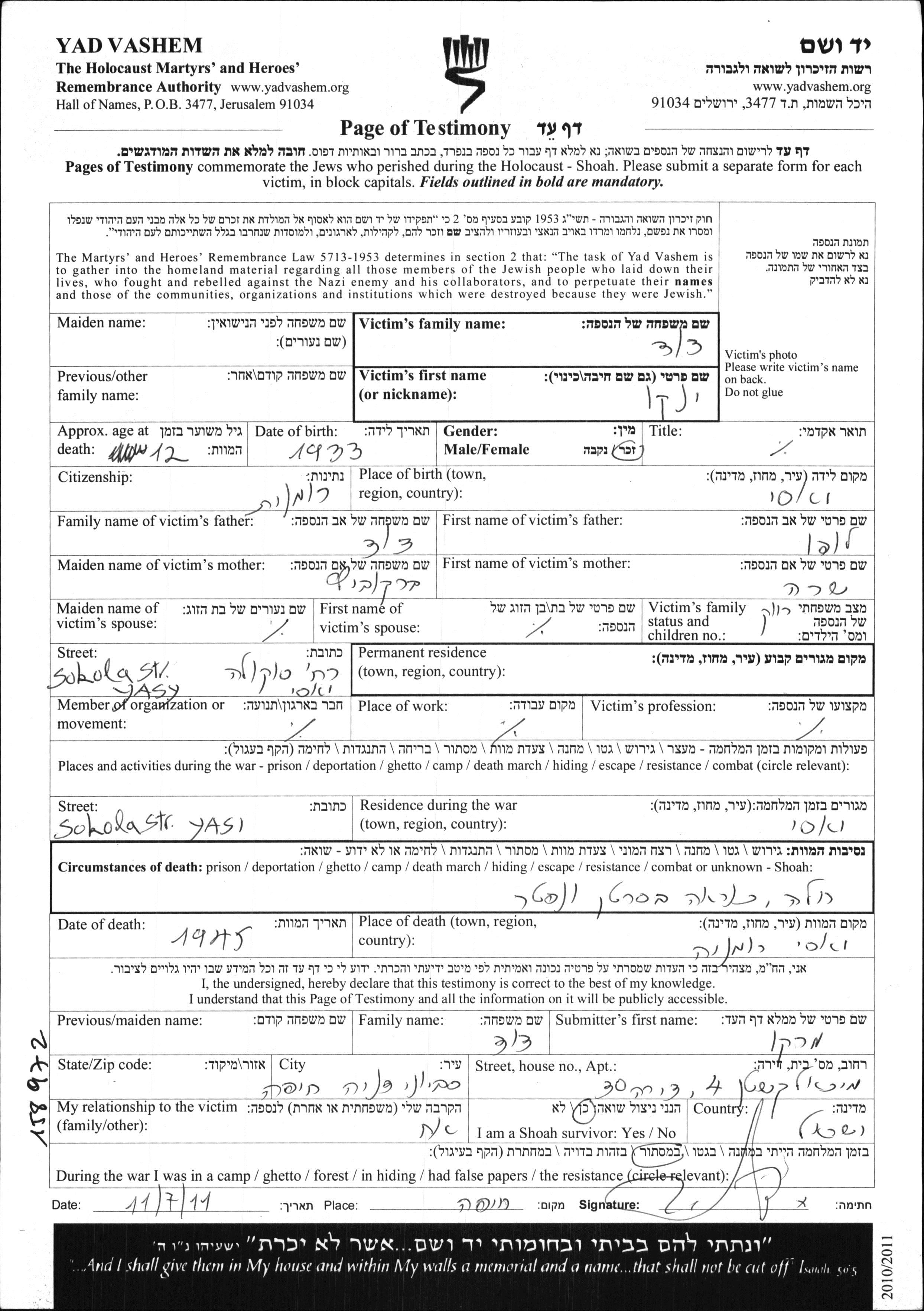 Yanku wurde in der Schoah ermordet. Todesort: Iasi, Rumänien im Jahr 1945.