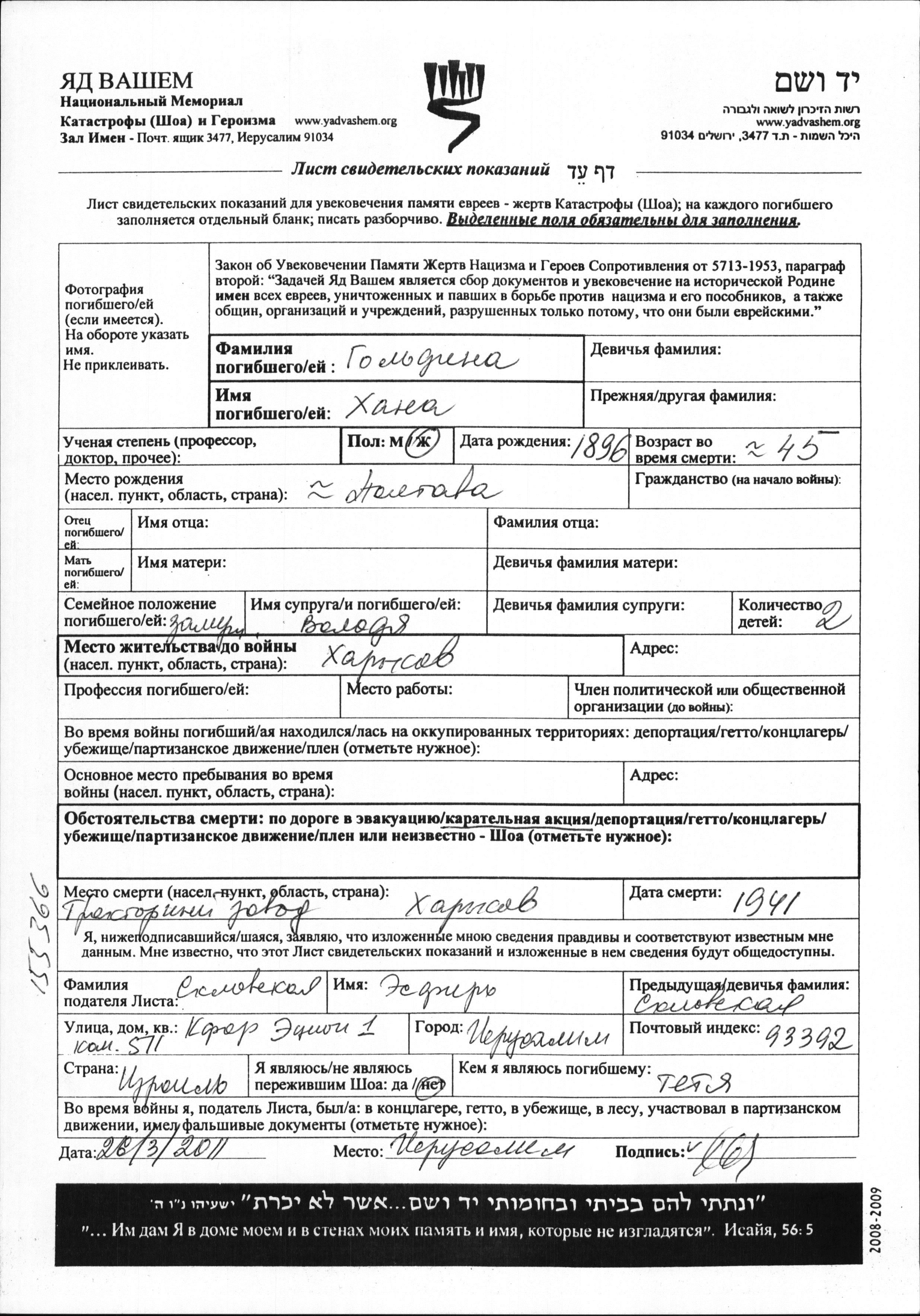 Khana Goldina wurde im Jahr 1896 in Poltava, Ukraine (UdSSR) geboren. Sie war mit Volodya Verheiratet. Vor dem Zweiten Weltkrieg lebte sie in Kharkov, Ukraine (UdSSR). Während des Krieges war sie in Kharkov, Ukraine (UdSSR).