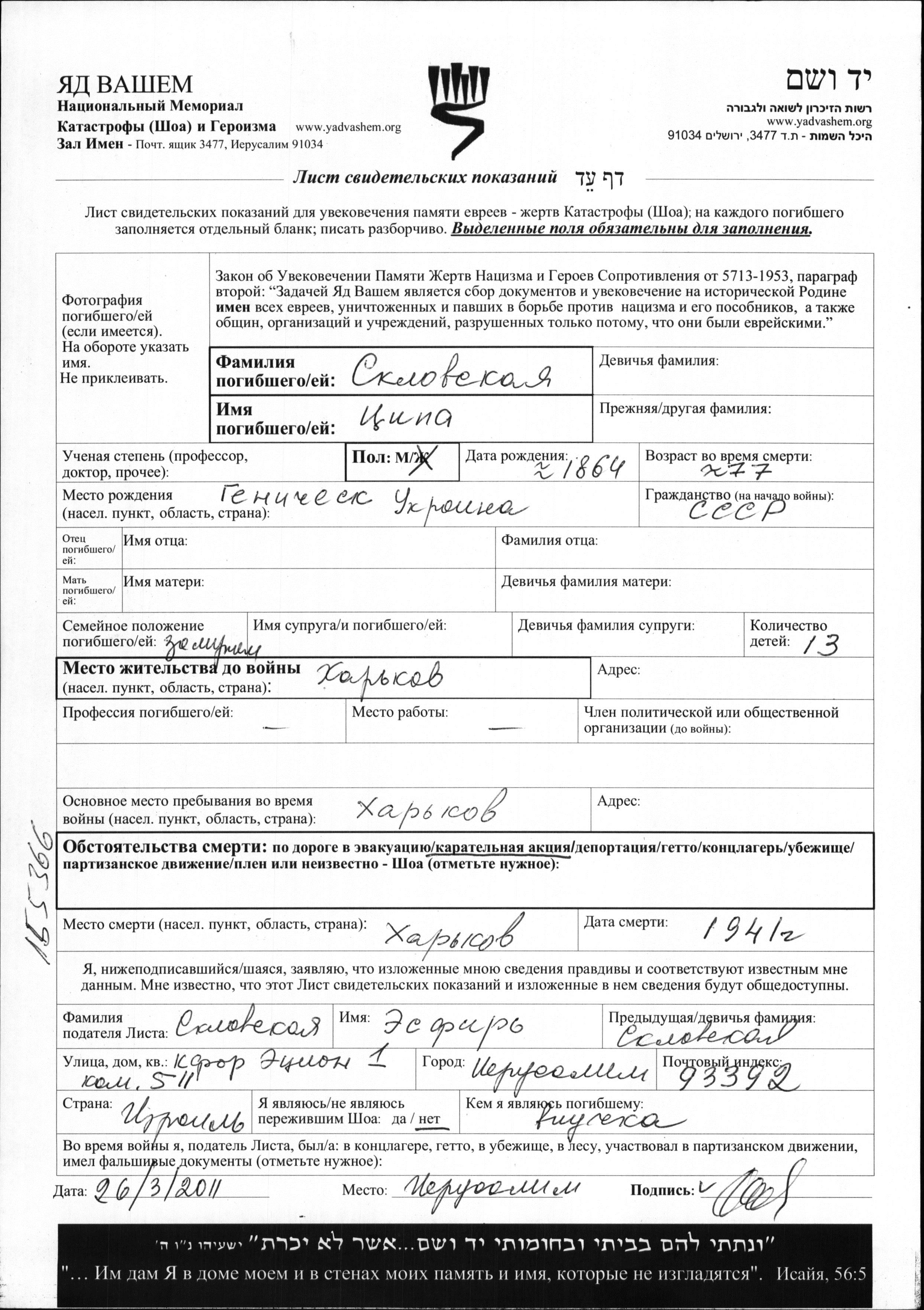 Tzipa Sklovskaya wurde im Jahr 1864 in Genichesk, Ukraine (UdSSR) geboren. Sie war Verheiratet. Vor dem Zweiten Weltkrieg lebte sie in Kharkov, Ukraine (UdSSR). Während des Krieges war sie in Kharkov, Ukraine (UdSSR).