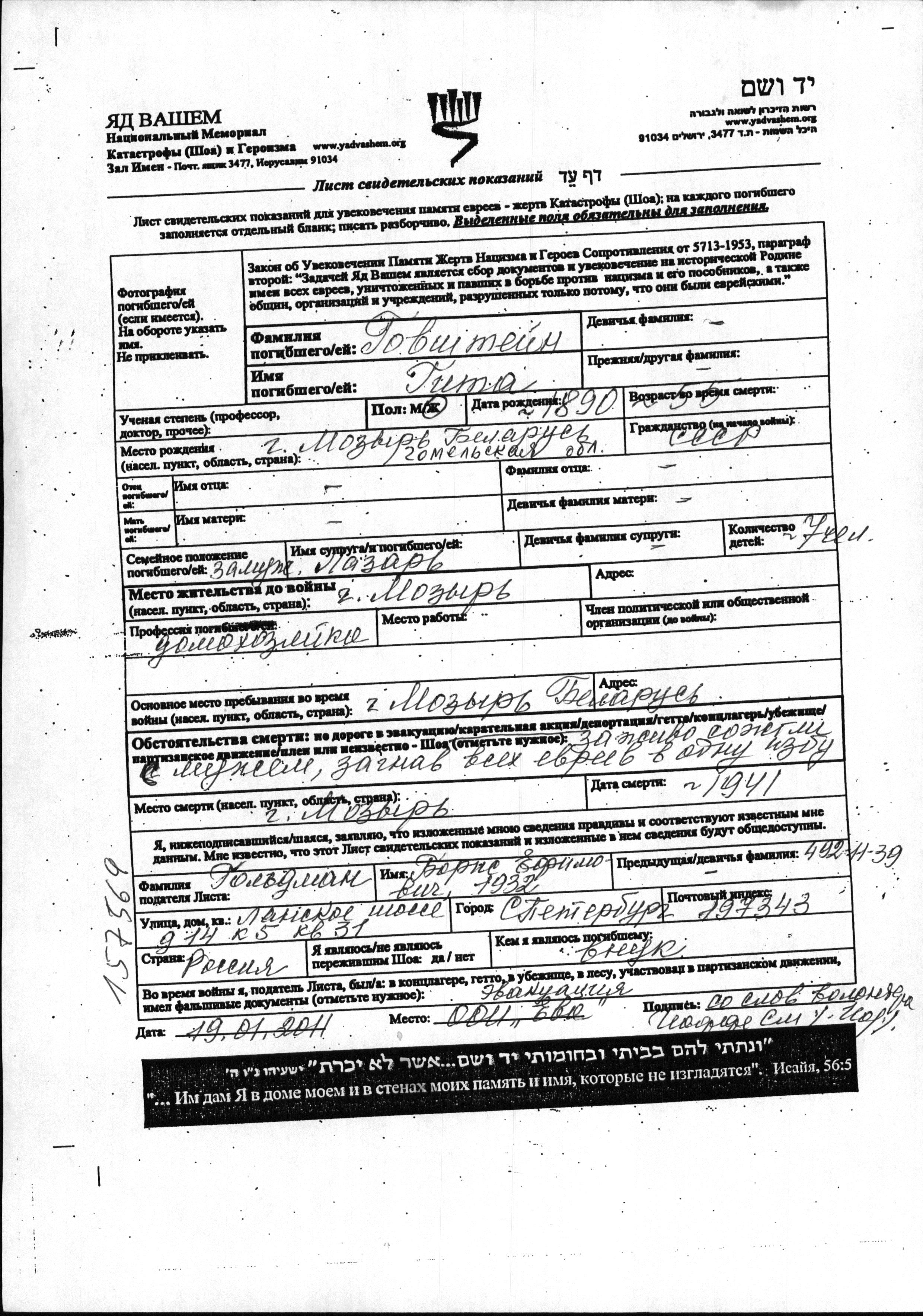 Gita Govshteyn wurde im Jahr 1890 in Mozyr, Weißrussland (UdSSR) geboren. Sie war Hausfrau und mit Lazar Verheiratet. Vor dem Zweiten Weltkrieg lebte sie in Mozyr, Weißrussland (UdSSR). Während des Krieges war sie in Mozyr, Weißrussland (UdSSR).