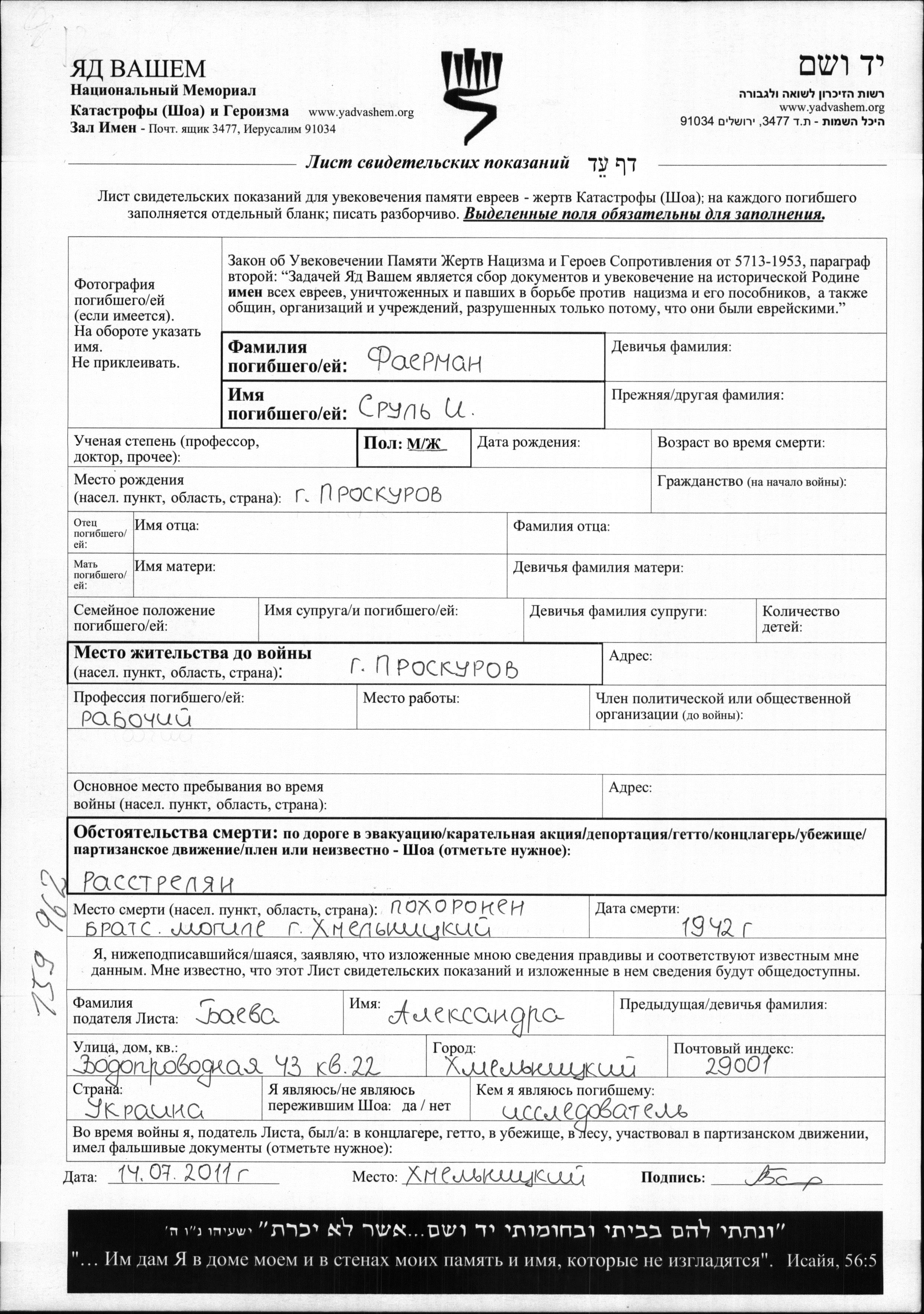 Srul Fayerman wurde in Proskurov, Ukraine (UdSSR) geboren. Er war Arbeiter/-in. Vor dem Zweiten Weltkrieg lebte er in Proskurov, Ukraine (UdSSR). Während des Krieges war er in Proskurov, Ukraine (UdSSR).